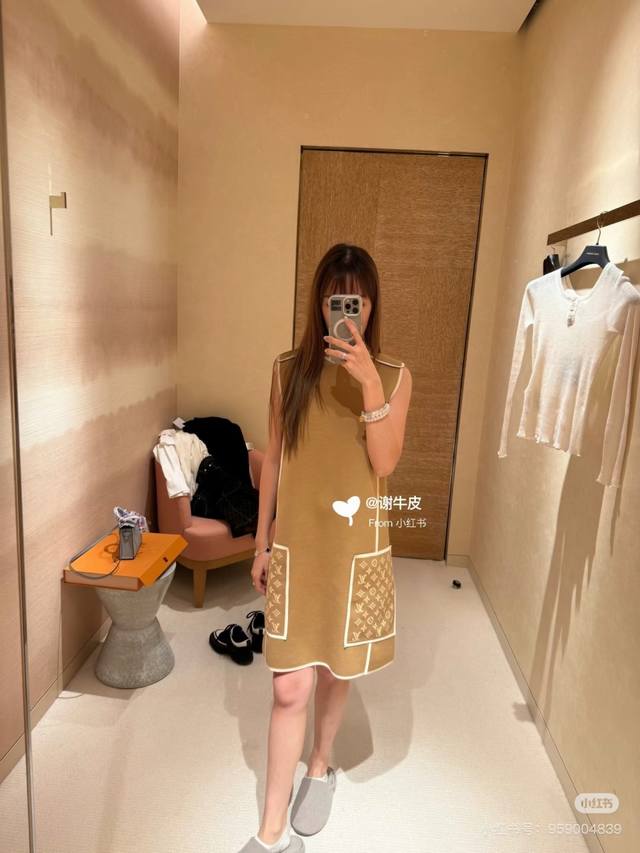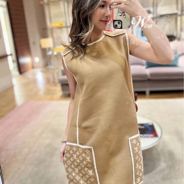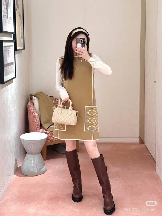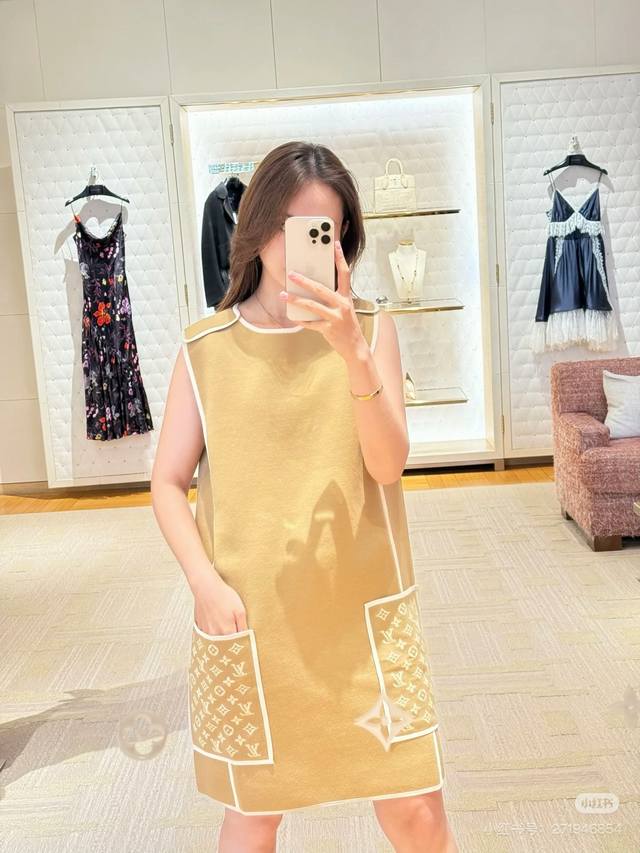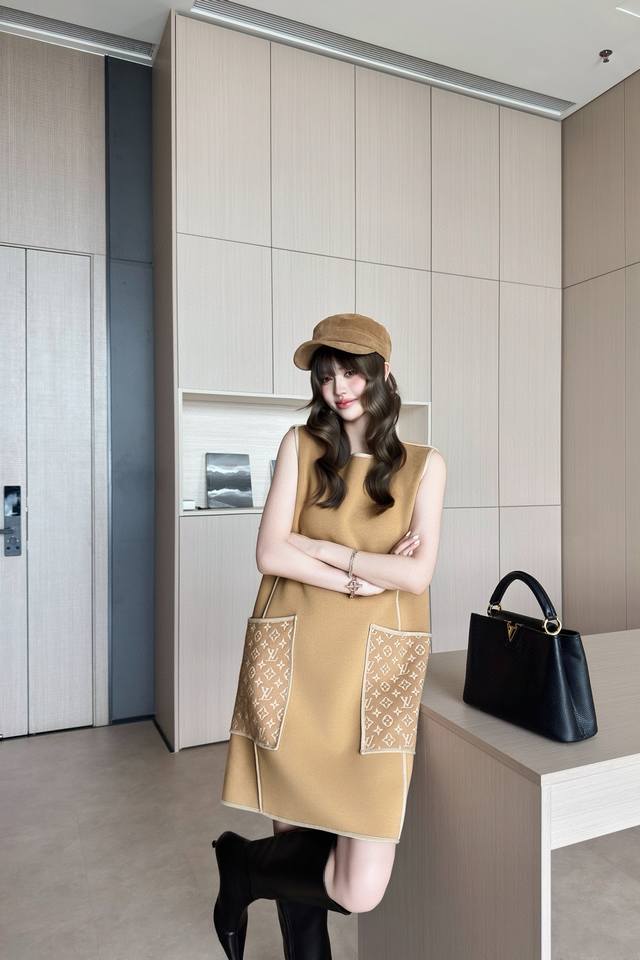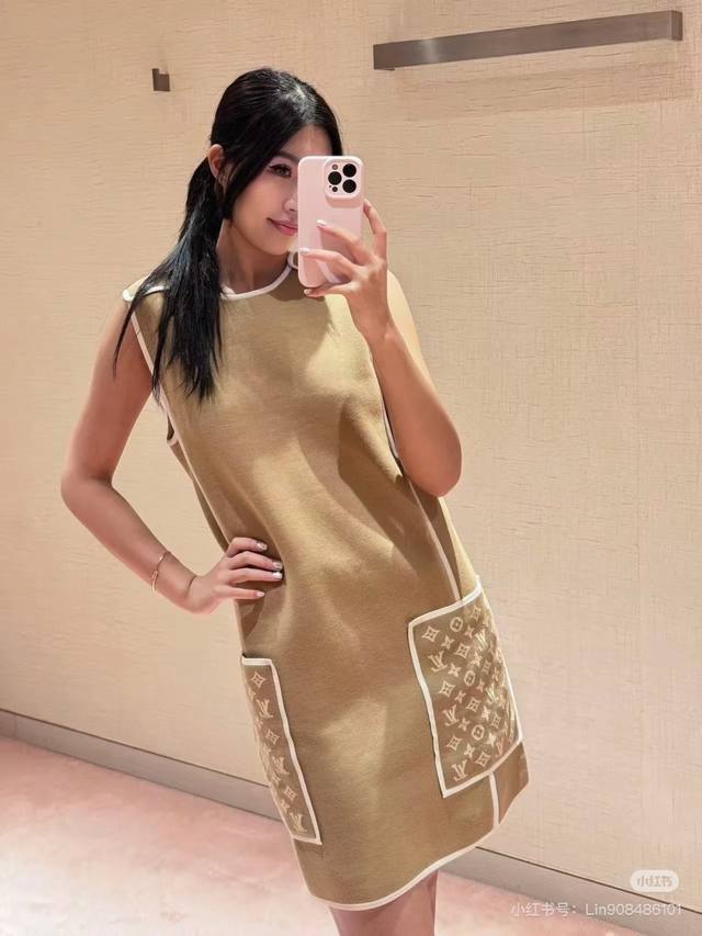 Louis Vuitton (LV) New Color-Blocked Monogram Logo Jacquard Double Pockets Patchwork Loose Fit Fashionable Versatile Sleeveless Dress, a Must-Have for Layering! Available in Brown, Black, Size M: Shoulder Width 37cm, Bust 100cm, Dress Length 85cm. (