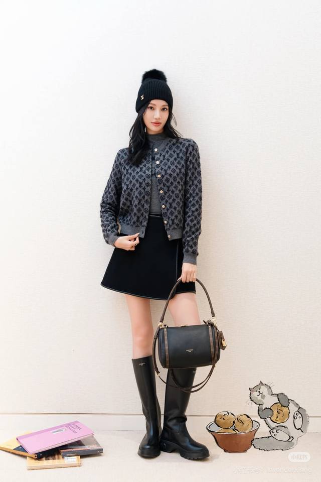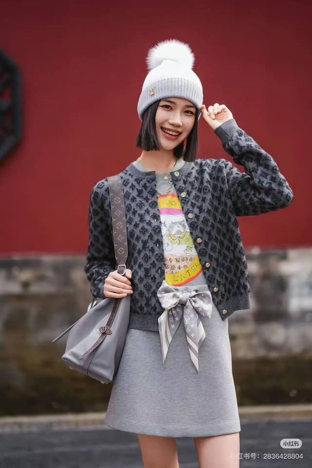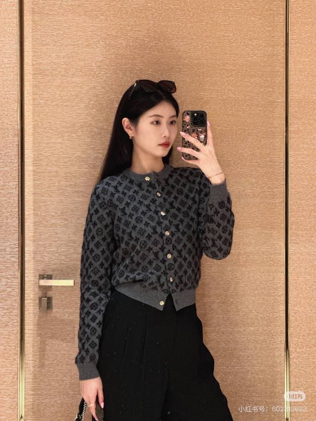 Louis Vuitton (LV) New High-End Custom Mohair and Wool Blend Fabric, Classic Monogram Logo Jacquard Wheat Ear Gold Button Single-Breasted Crew Neck Long-Sleeve Knit Cardigan! Light Camel, Dark Gray, Size M: Bust 92cm, Sleeve Length 61cm, Length 54cm. (Stretch fabric, measurements for reference only.)