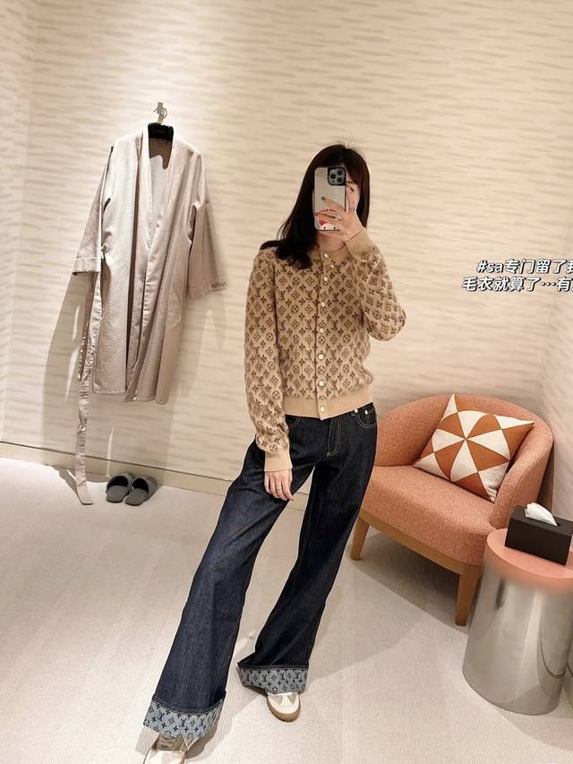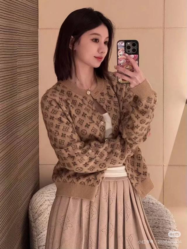 Louis Vuitton (LV) New High-End Custom Mohair and Wool Blend Fabric, Classic Monogram Logo Jacquard Wheat Ear Gold Button Single-Breasted Crew Neck Long-Sleeve Knit Cardigan! Light Camel, Dark Gray, Size M: Bust 92cm, Sleeve Length 61cm, Length 54cm. (Stretch fabric, measurements for reference only.)