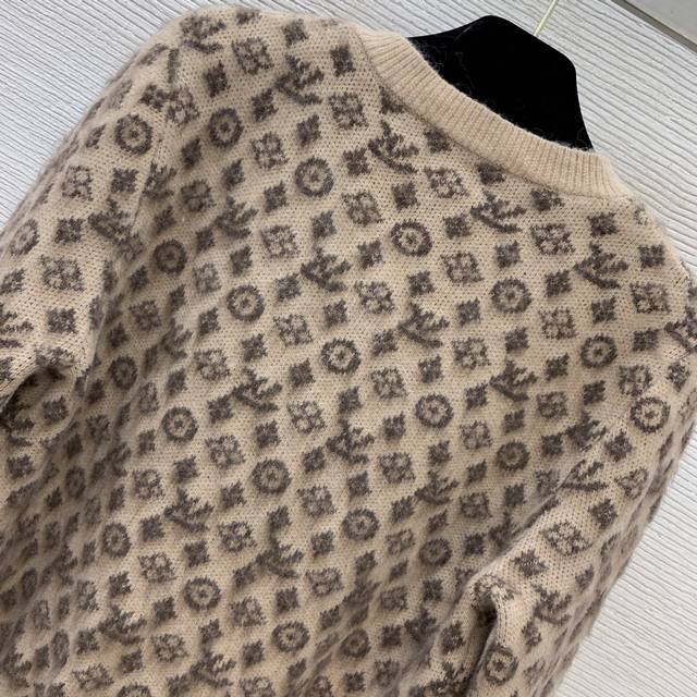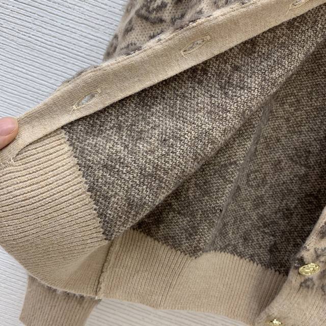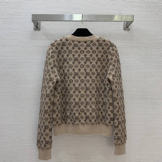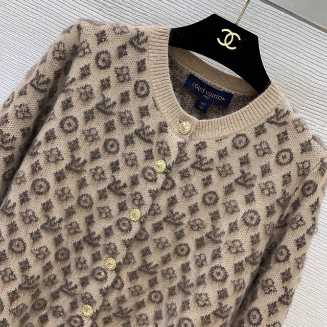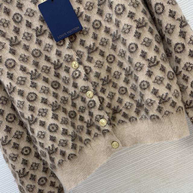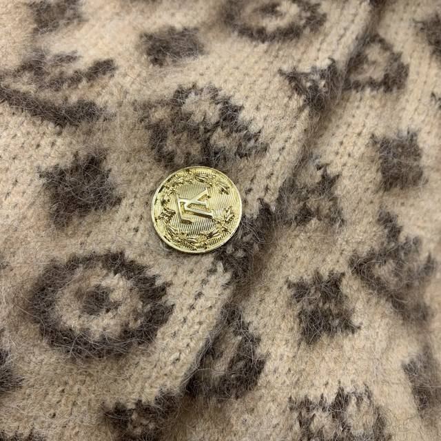 Louis Vuitton (LV) New High-End Custom Mohair and Wool Blend Fabric, Classic Monogram Logo Jacquard Wheat Ear Gold Button Single-Breasted Crew Neck Long-Sleeve Knit Cardigan! Light Camel, Dark Gray, Size M: Bust 92cm, Sleeve Length 61cm, Length 54cm. (Stretch fabric, dimensions for reference only.)