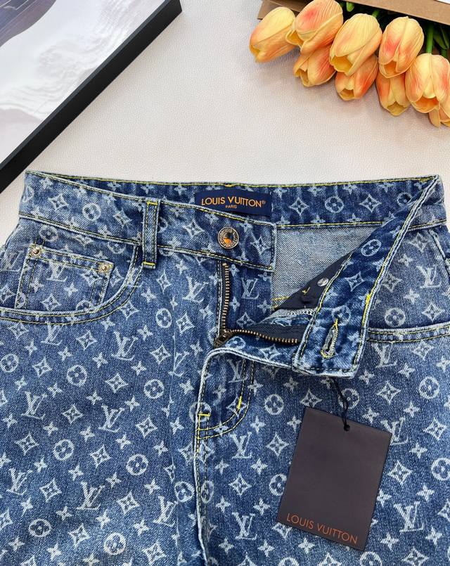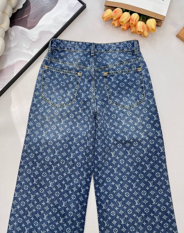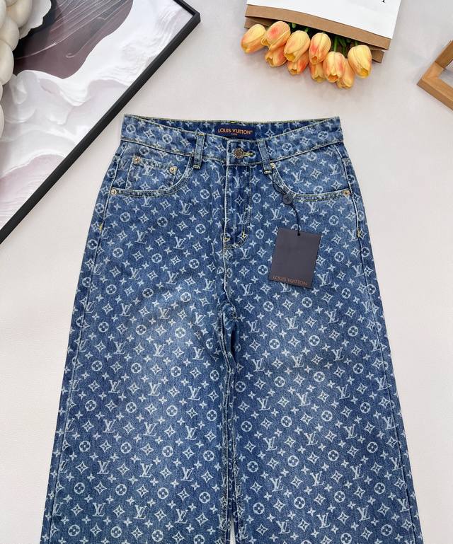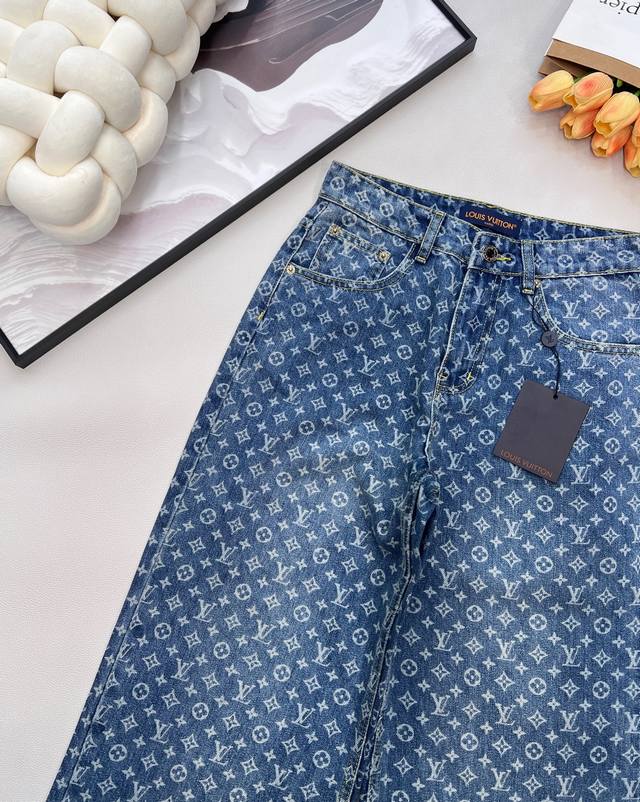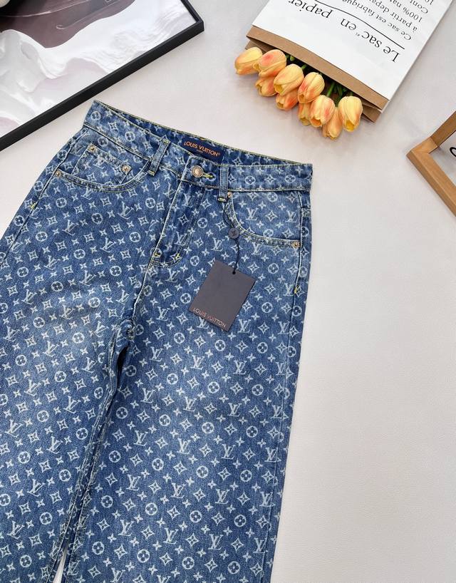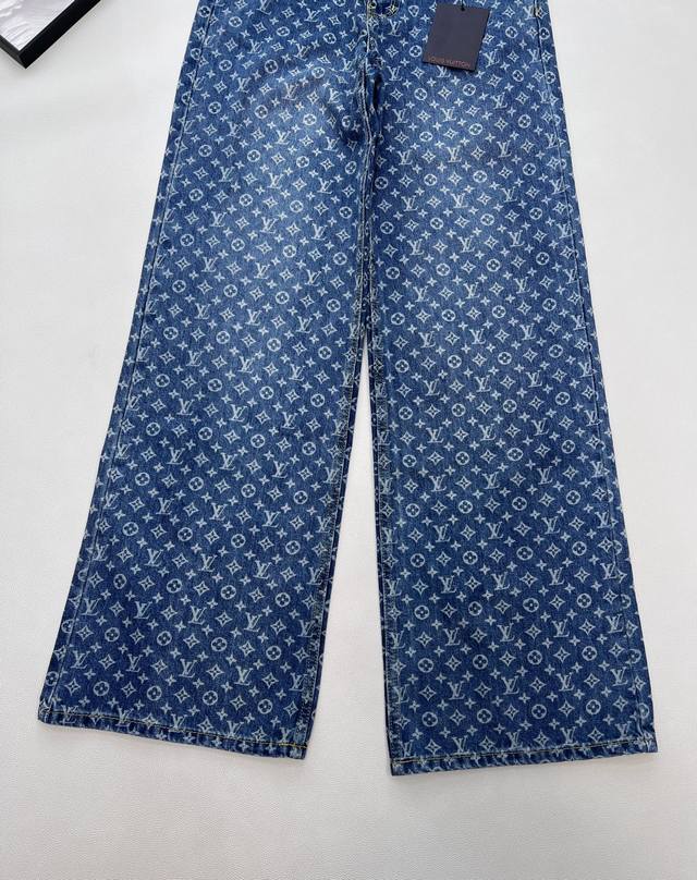 Louis Vuitton New Laser Burnished All-Over Print Jeans (Ddd). Made with custom Sirospun jacquard fabric, color-fixed and softened, with custom hardware. These jeans are absolutely stunning! The slightly flared cut is incredibly stylish and versatile, pairing well with various tops. The mid-to-high waistline creates a flattering 3:7 body proportion even for petite figures. The laser burnished all-over print is unique and fashionable, ensuring you won't see anyone else wearing the same style. Everyone who wears them will have long, slender legs! Highly recommend the retro blue