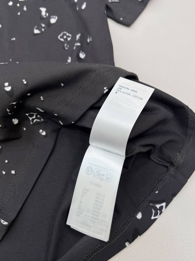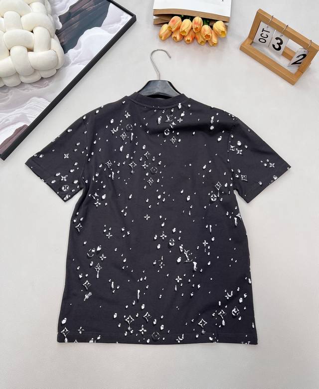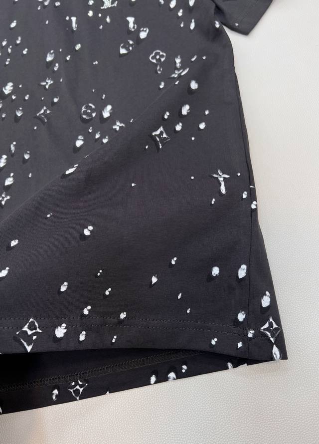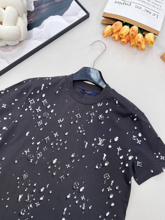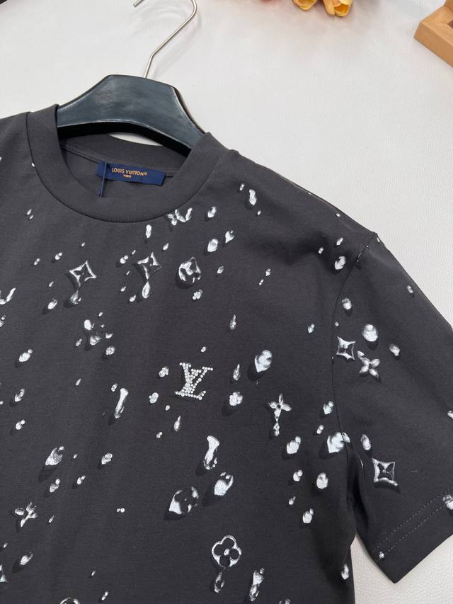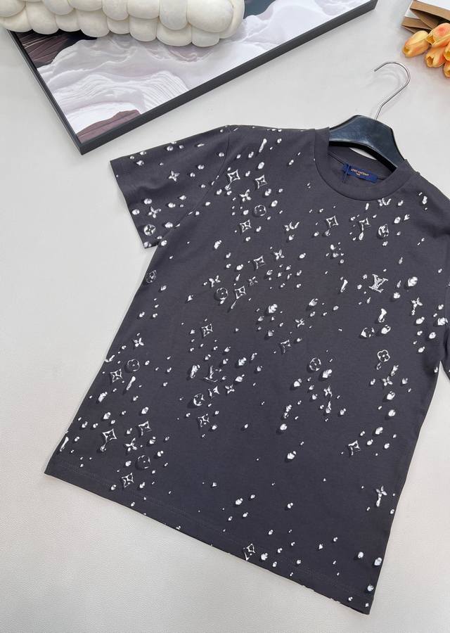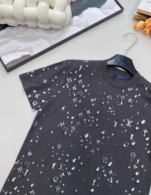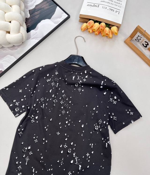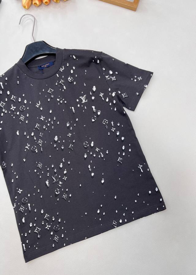 Louis Vuitton's new teardrop print crew neck short-sleeved shirt, made from custom-made original fine cotton knit fabric. The combing process removes short fibers and impurities, making the yarn smoother and stronger. The resulting fabric has a tight structure, a smooth surface, and a soft, refreshing feel. It features a high-quality Ddd full-width teardrop element logo print, an optical illusion Monogram teardrop pattern, processed using a white foam digital direct-to-garment printing process. This is an advanced digital printing technology. White foaming paste is printed directly onto the fabric through a high-precision printhead, and then baked at high temperature. The foaming agent in the paste expands when heated, forming a slightly three-dimensional and soft-touch micro-texture. It creates a unique texture similar to water droplets or foam, achieving an optical illusion effect. Compared to traditional offset printing, it is non-stiff, non-breathable, and more durable; compared to embroidery, it is lighter and can achieve more delicate color gradations and details, perfectly simulating the dynamic shape of water droplets. Ddd's rhinestones are precisely set using automated laser positioning, fixing each tiny rhinestone into the logo's shape. The rhinestones' three-dimensional angular structure reflects light from multiple angles, creating a strong visual and tactile contrast with the surrounding matte cotton fabric and slightly raised white foam print, instantly becoming the visual focal point. Ddd ensures a durable fit with a ribbed collar and creates an immersive brand atmosphere with a full-coverage logo print. This T-shirt harmoniously integrates multiple techniques, creating a unique style that is both street-style and luxurious, casual and sophisticated. Unisex, all tags included. Bulk orders available. Ddd sizes: X, s, s, ml. Ddd code: L. DDD