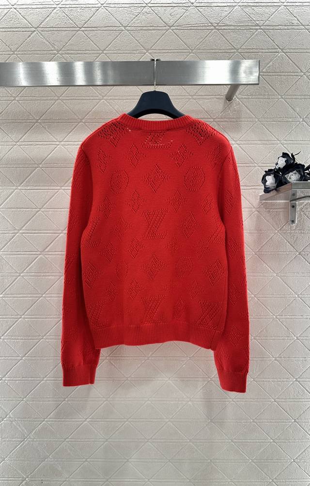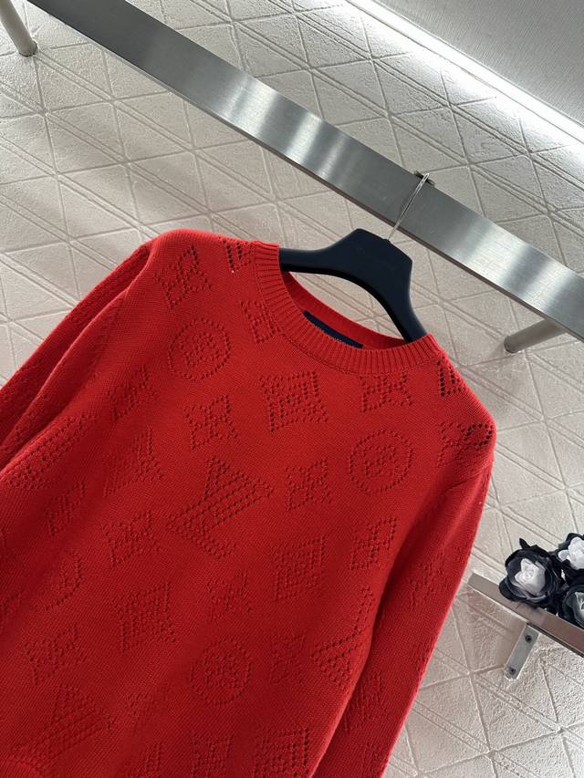 Louis Vuittp*2025 New Arrival Ddd Jacquard Hollow-out Logo Knit Sweater Ddd Custom Yb wool yarn, stretchy and comfortable, with a rich texture. The round neck pullover sweater offers a casual and relaxed style. It features an all-over hollow-out four-leaf clover logo and letter design, and ribbed elastic trim. Stylish and eye-catching whether worn alone or layered. A must-have item for the end of the year, this bright red sweater is flattering and chic. Custom fabrics and accessories, high-quality version, red DDD