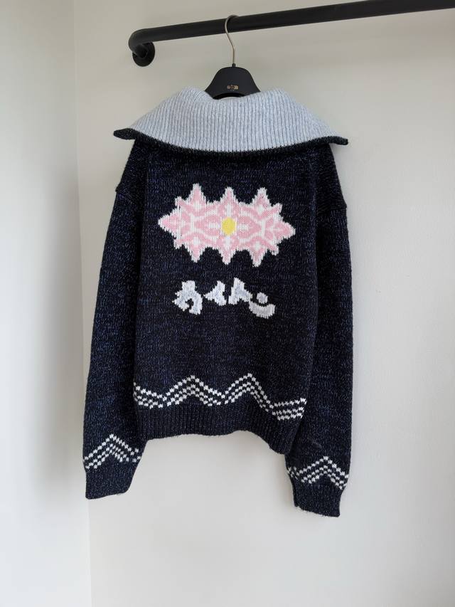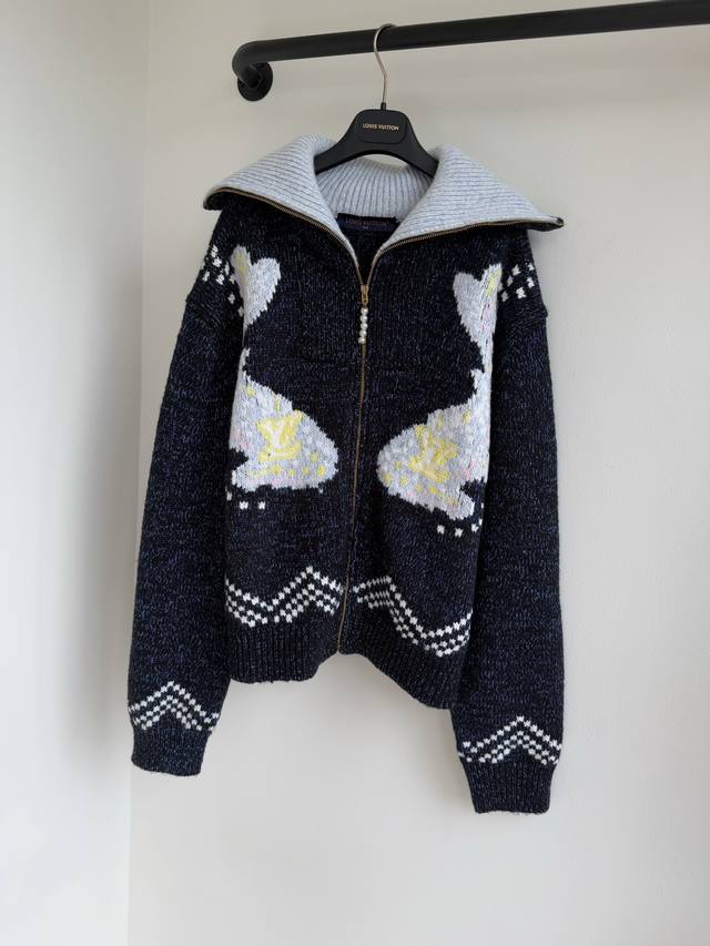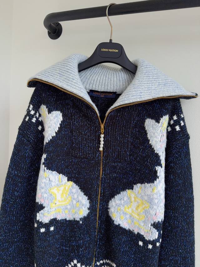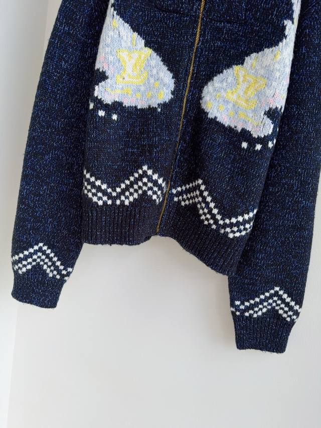 Louis25's new fall zippered knitted waisted jacquard jacket is now available. This waisted jacket showcases the creative vision created by Pharrell Williams and Nigo for the Fall/Winter 2025 season. A koi fish adorned with the logo swims across the front, while the logo behind the logo reveals Nigo's cultural roots. The exquisite pattern is rendered in intarsia and embroidery on the cotton-wool blend knit, creating a delicate, handcrafted look. The beaded zipper pull adds an elegant touch to the comfortable silhouette. Available in S, M, L, D,