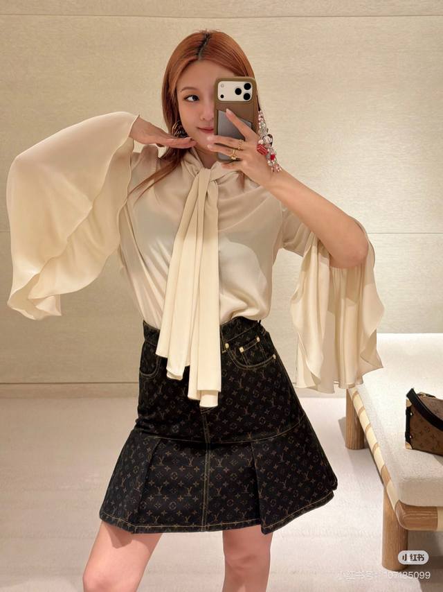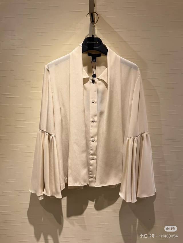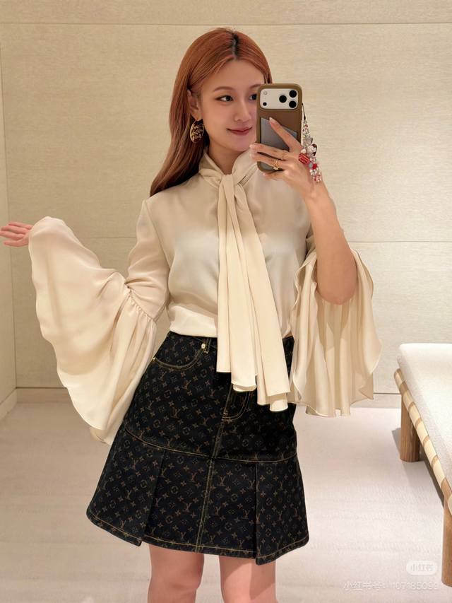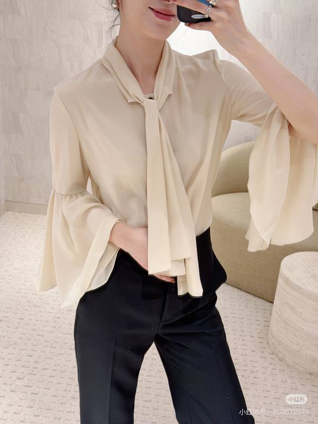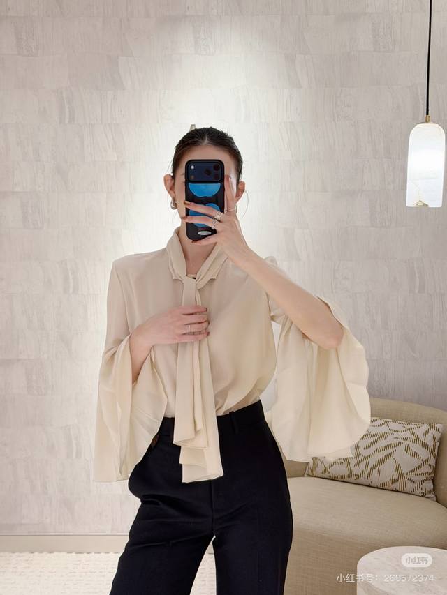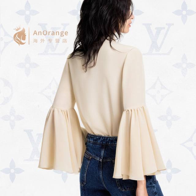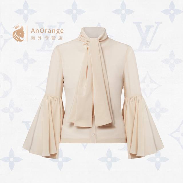 Louis*LV New Custom Letter Logo Button Flowing Collar Bow Tie Decoration Loose and Versatile Ruffled Bell Sleeve Blouse! Apricot, Size M: Shoulder Width 37cm, Bust 96cm, Sleeve Length 59cm, Length 59cm (DDD)