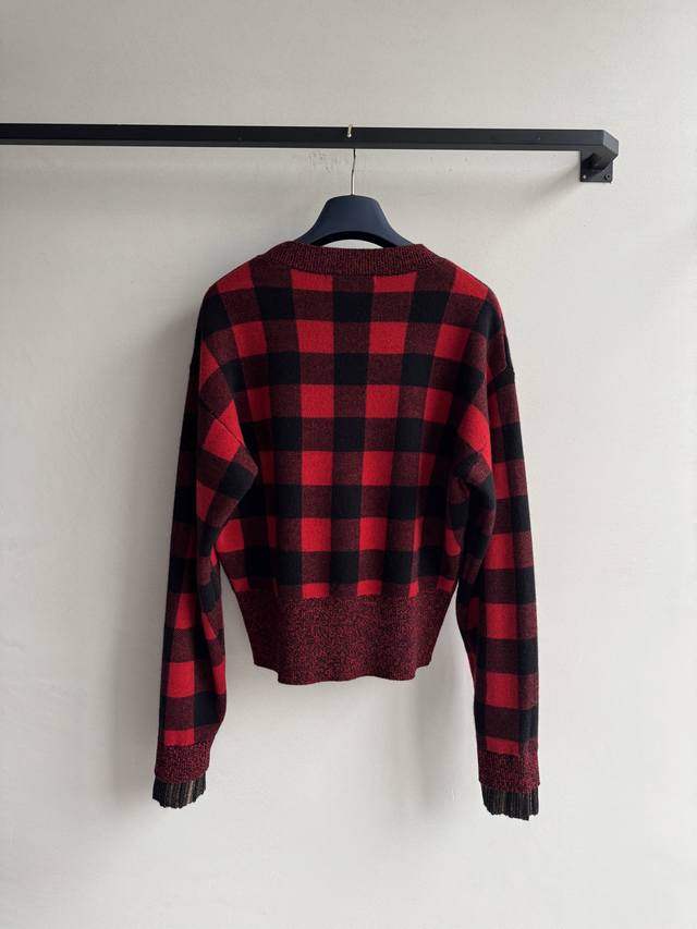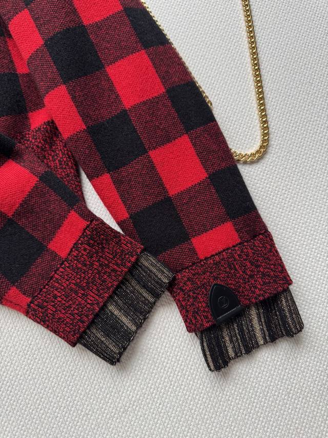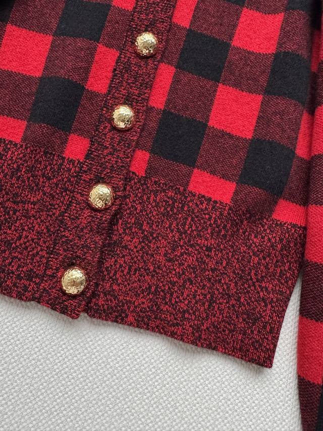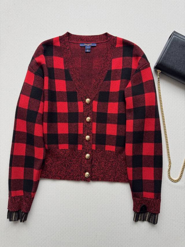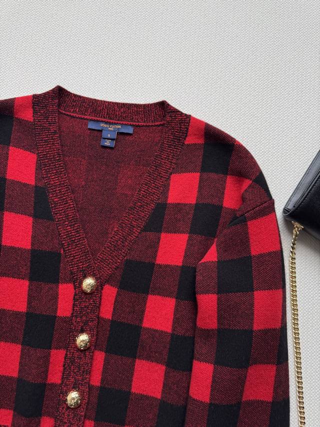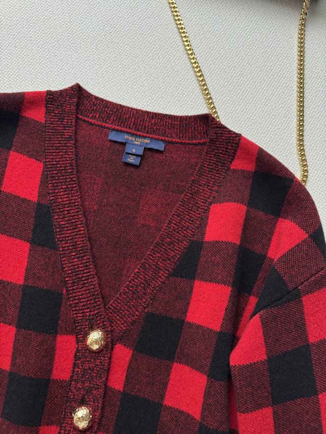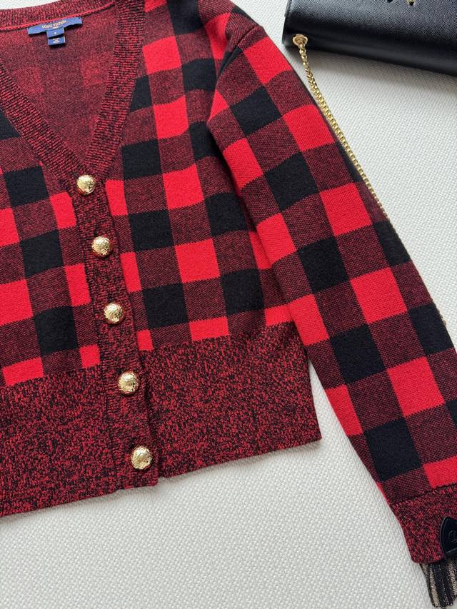 Louisvuitto* 25 Early Fall new red and black plaid V-neck knitted cardigan. Amer