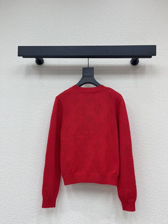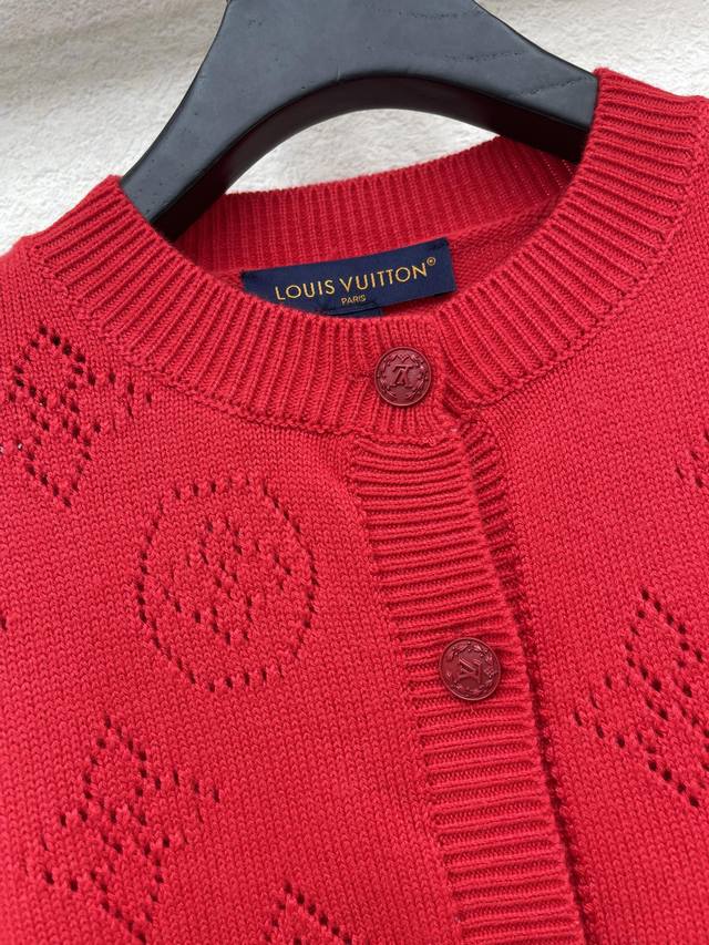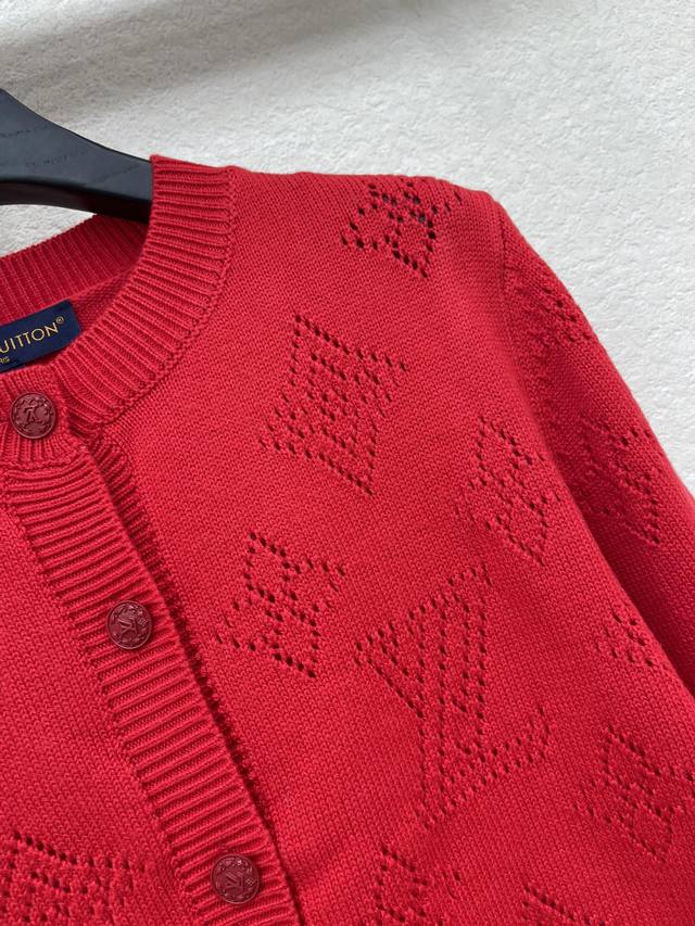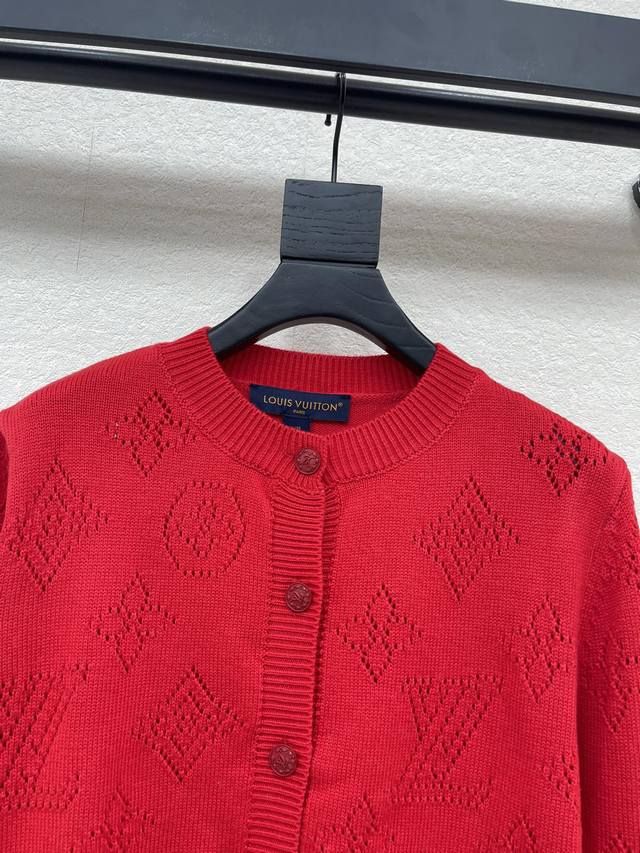 Lv Louis Vuitton*25 Autumn/Winter New Knitted Crew Neck Cardigan Brand Logo Pattern Hollowed-out Jacquard Decoration Yb Mold Opening Letter Logo Button Embellishment Christmas Atmosphere Essential for Outfit Sizes Sml Aa DDD