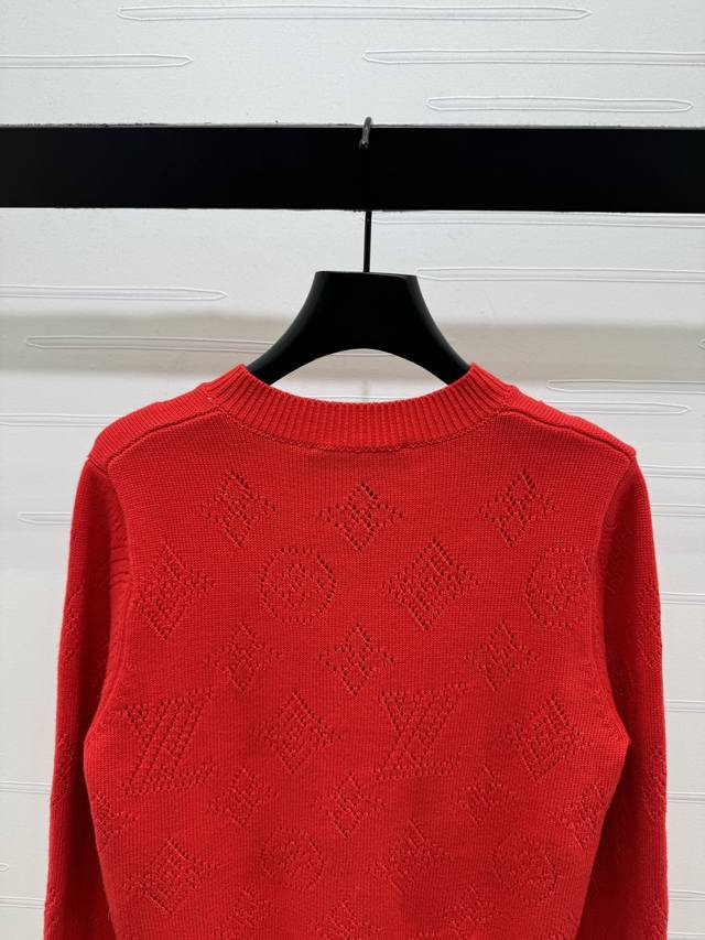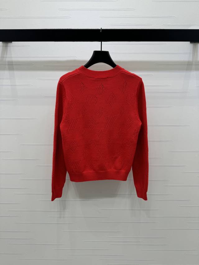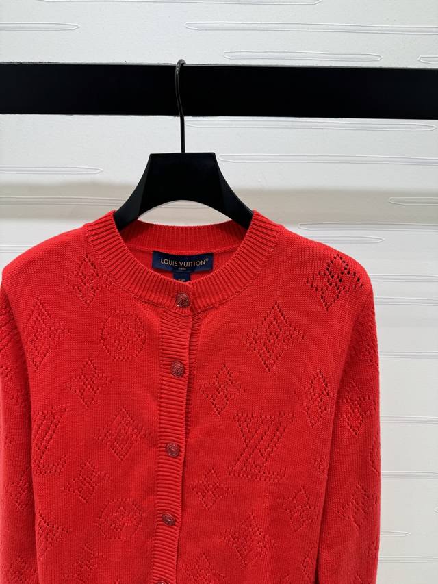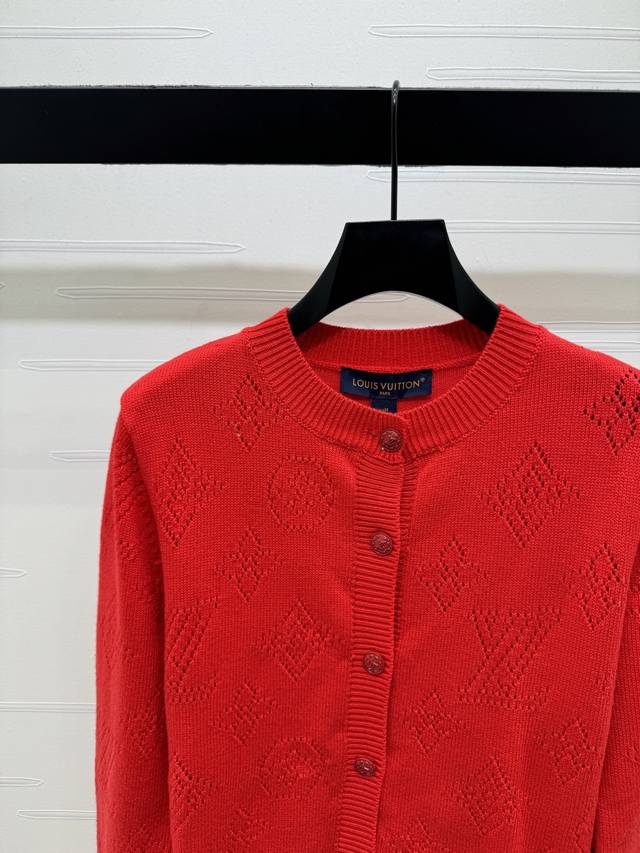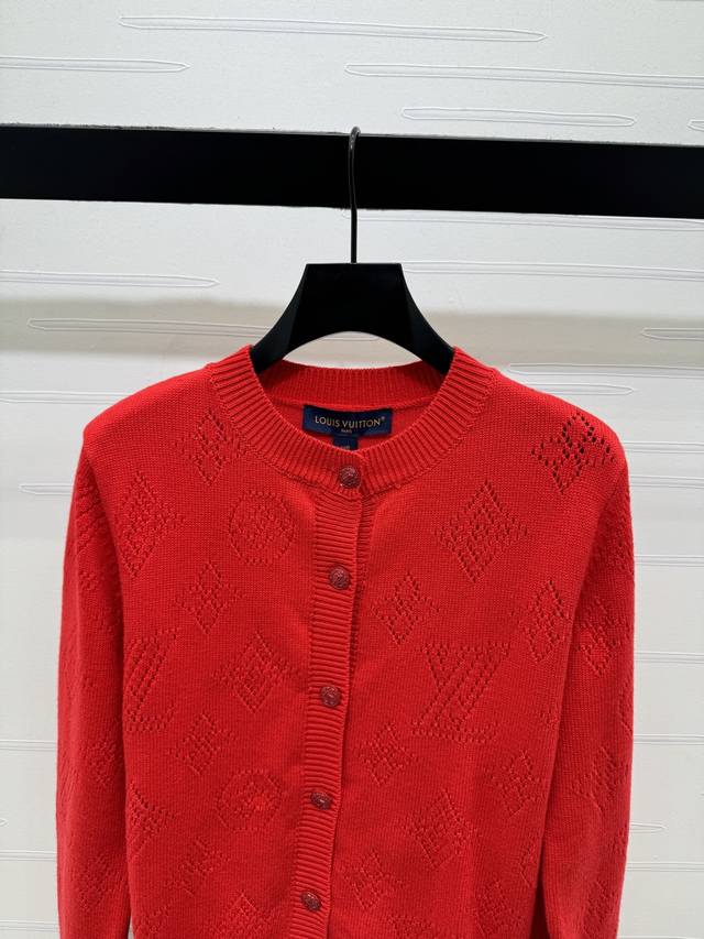 New Arrival! High-end Louis Vuitton 2026 Early Spring Collection! Jacquard Openwork Logo Knit Cardigan! Crafted from custom wool yarn, it's stretchy, comfortable, and has a luxurious feel. The round neck design creates a relaxed and casual look. It features an all-over openwork four-leaf clover logo and lettering design, a button-down collar, and ribbed elastic trim for added ease of wear and a relaxed feel. A must-have item for the end of the year, this vibrant red cardigan is flattering and stylish! Available in 1 color! Sizes SM-L3! High-quality bulk order A706B360C DDD