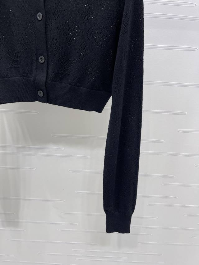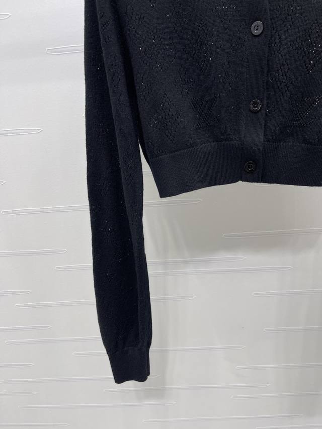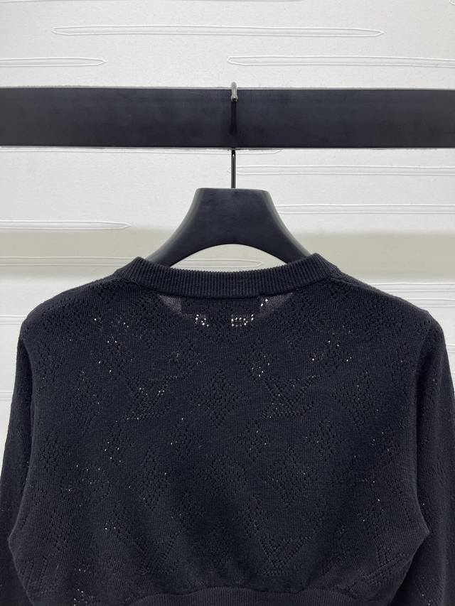 New, original, high-quality Louis Vui*Ton 2025 Early Fall collection! A hollow-knit, short, long-sleeved cardigan! Woven from custom wool yarn for a premium, comfortable, soft feel. Round neck, straight-shoulder, short knit cardigan with a sleek, sleek, and flattering logo. The hollowed-out pattern complements the lettering for a stylish, alluring, and gentle look. Elastic hems accentuate the high-end aesthetic. The exposed waist accentuates the figure, evoking a youthful, energetic look. A versatile, everyday piece for all seasons! One color! 3 sizes SM-L! High-quality, bulky stock. A706B380C