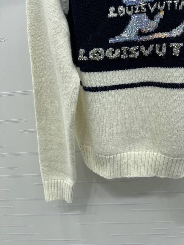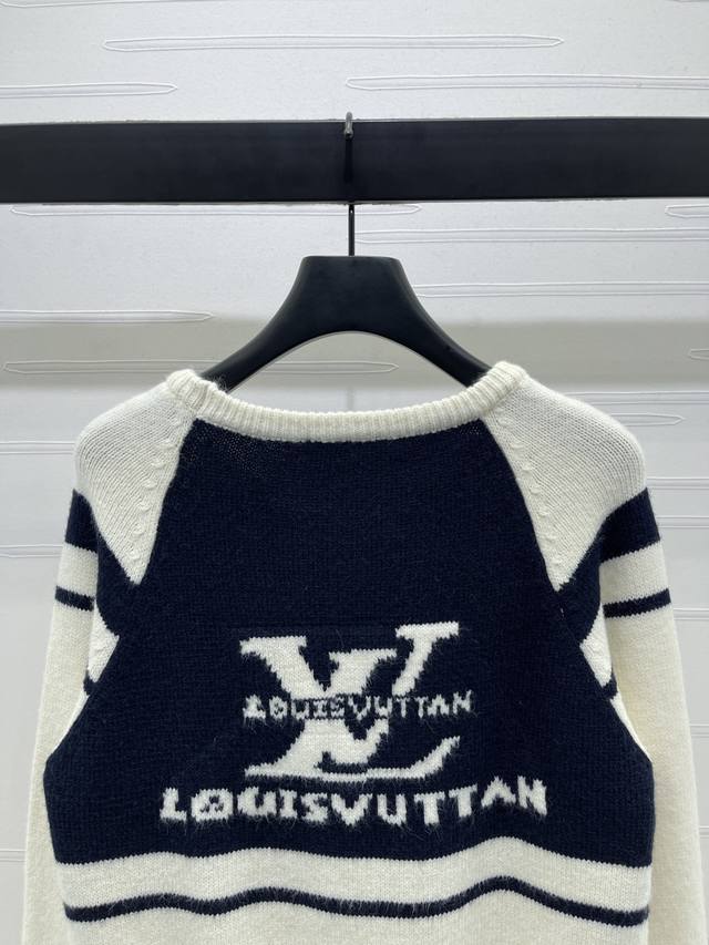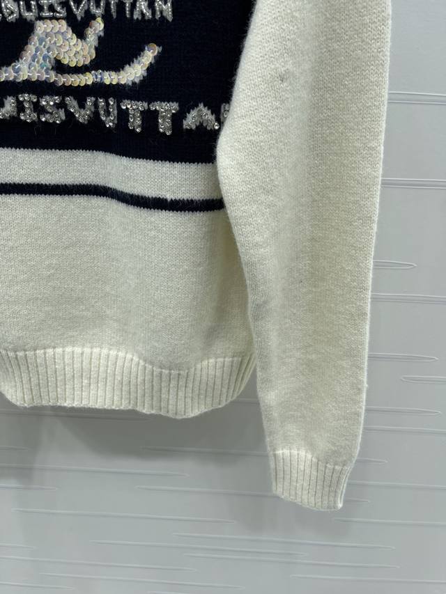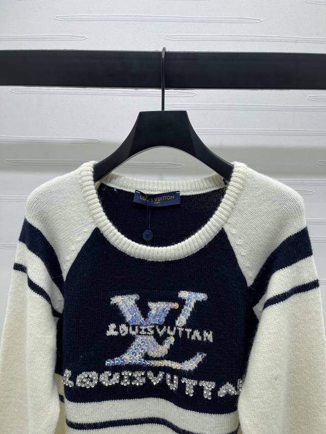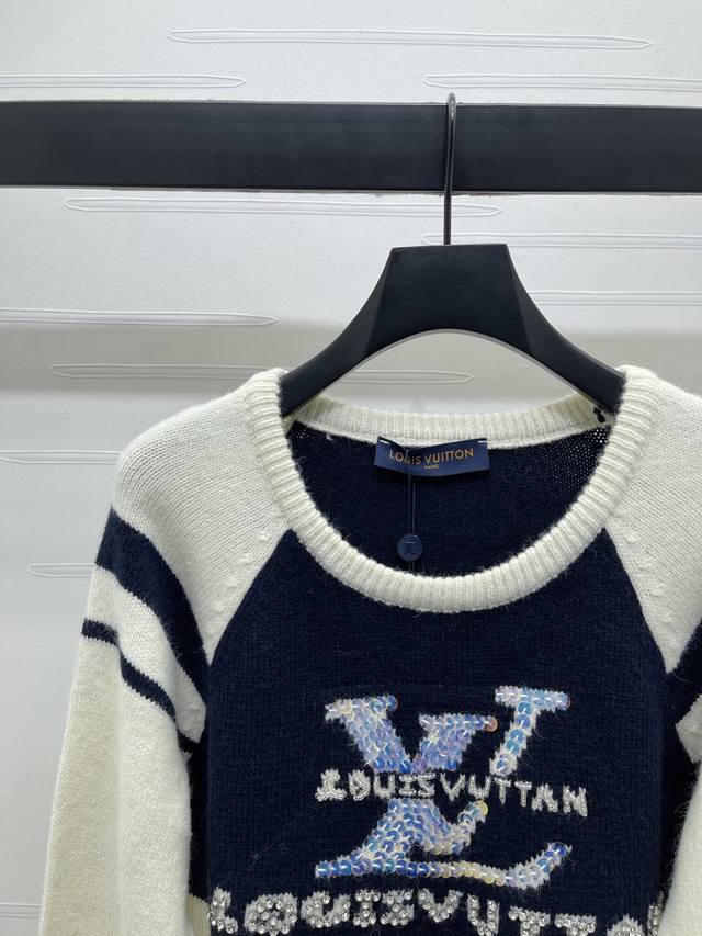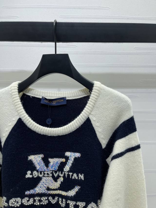 New, original, high-quality Louis Vui*Ton 2025 Early Fall collection! Crew-neck knitted pullover sweater! Custom-woven wool yarn for a premium, comfortable, and soft look. The round neck, long-sleeved sweater features a dense knit with ribbed details for added warmth and windproofing. Wide, ribbed cuffs match the hem. The full, monogrammed logo on the chest, heavily beaded, highlights the brand's signature detail. The contrasting arm bars and raglan shoulder design create a regular fit for a simple, versatile, stylish, and fashionable fall and winter look. Available in one color! Sizes SM-L3! High-quality, bulky stock A706B340C