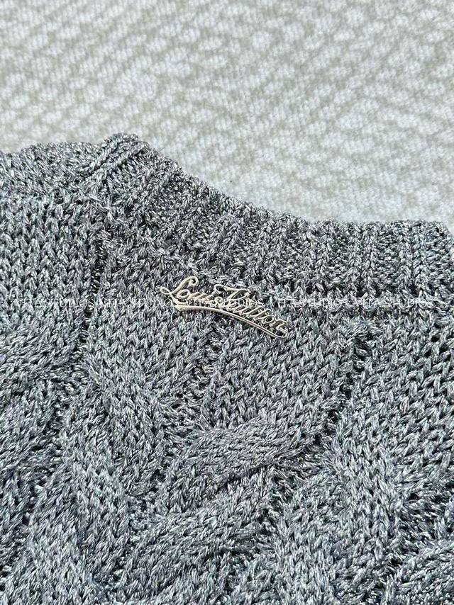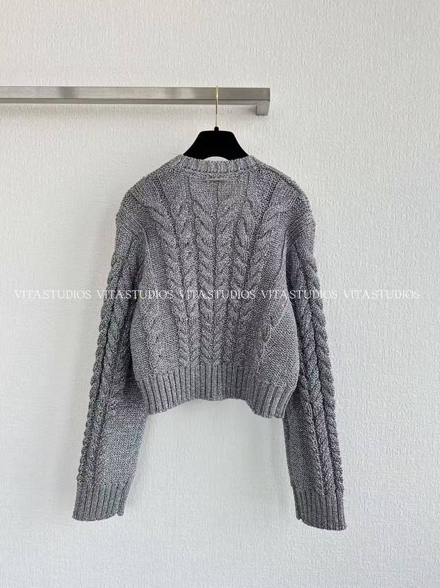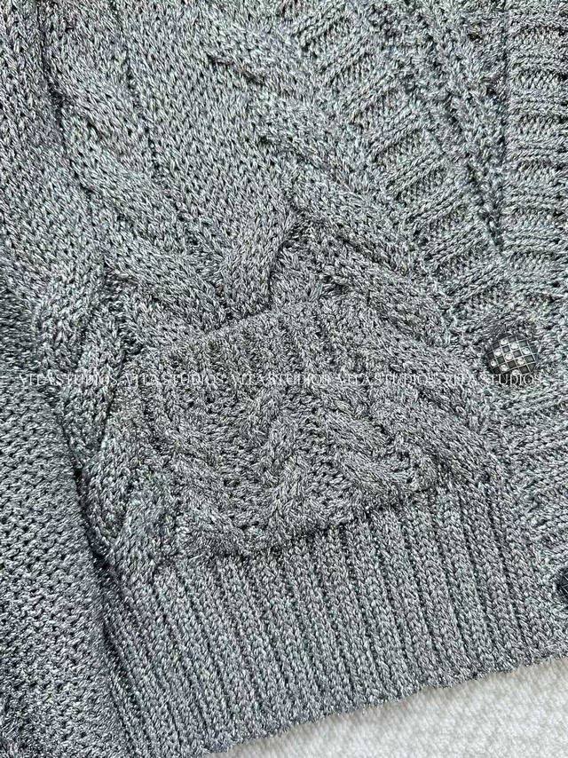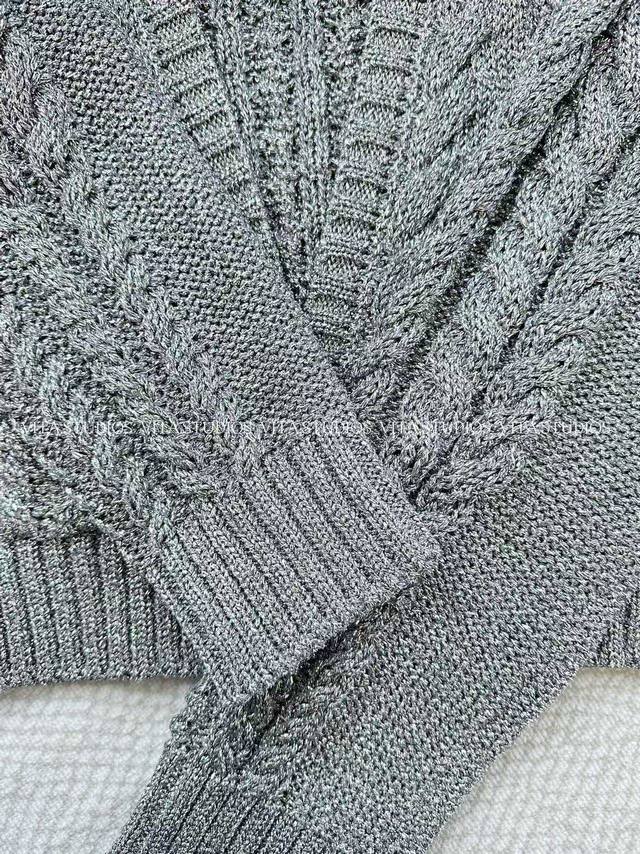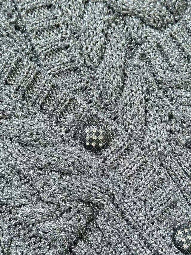 New Product Launch DDD Knitted V-Neck Cardigan Ddd Made with a blend of 75% metallic PET and 25% polyester Ddd The metallic PET gives the fabric a unique sheen Ddd Micron-sized metallic flakes are blended into the PET fibers, creating a subtle silver-gray shimmer effect Ddd Polyester enhances the fabric's resilience, ensuring the three-dimensionality of the knit texture Ddd It also enhances wrinkle resistance and durability, making it less prone to snagging and deformation Ddd It features a "three-dimensional cable knit" with a predominantly coarse cable knit texture Ddd The cable knit units are full and three-dimensional Ddd The V-neck optimizes the shoulder and neck proportions, and the placket buttons are metal mesh rhinestone buttons Ddd A metal brand logo tag is attached to the back of the garment DDD Color: Gray Ddd Sizes: SML Dd d Lv*Hx DDD
