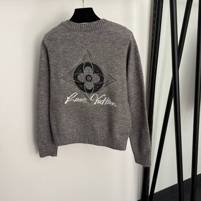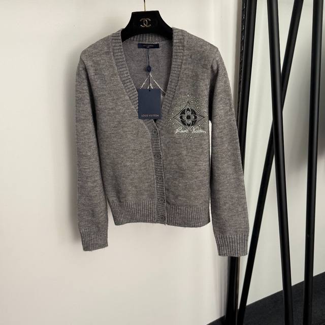 Style No. 20256920 Lv* New Logo Rhinestone V-Neck Long-Sleeve Knit Cardigan, White, Gray, Blue, One Size: Shoulder Width 39, Bust 94, Sleeve Length 58, Length 55; Weight: 0.365Kg.