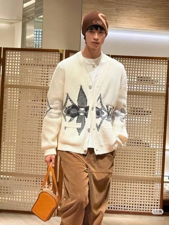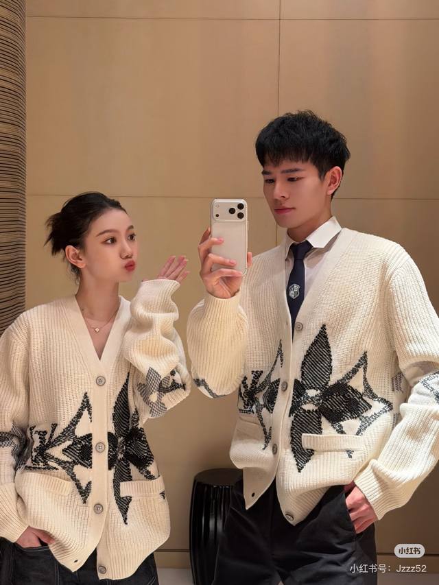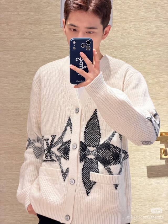 Unisex Louis Vuitton LV New High-Version Classic Four-Leaf Jacquard Double Pocket V-Neck Loose Long-Sleeve Knit Cardigan! Off-White, Size M: Shoulder Width 45cm, Chest 102cm, Sleeve Length 71cm, Length 72cm. Wholesale.