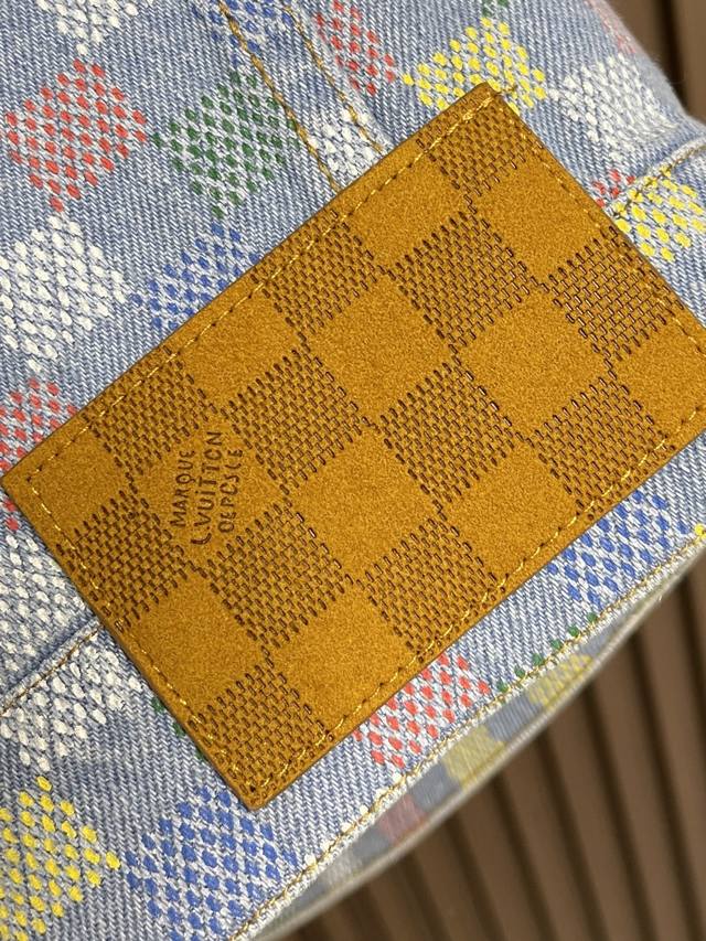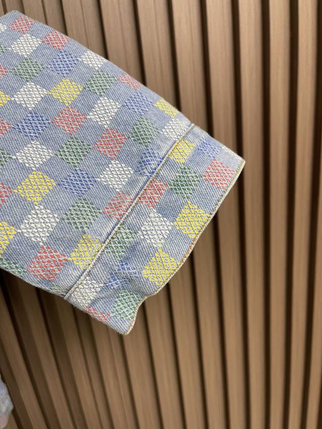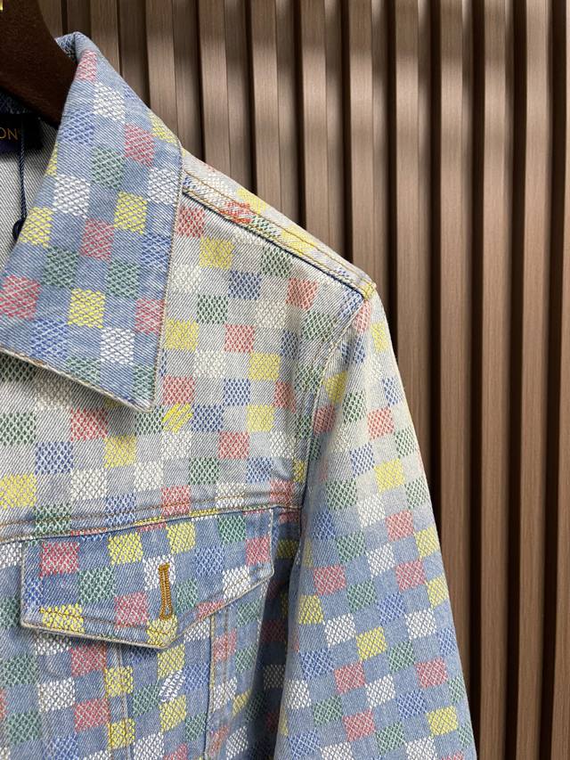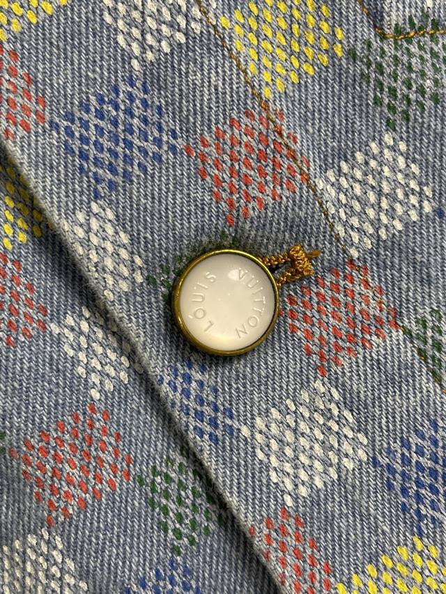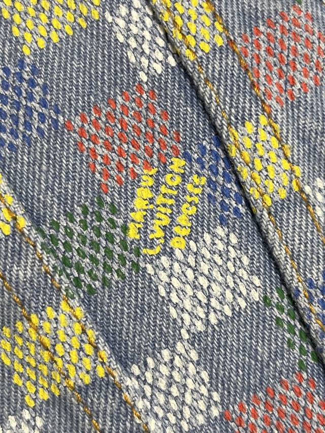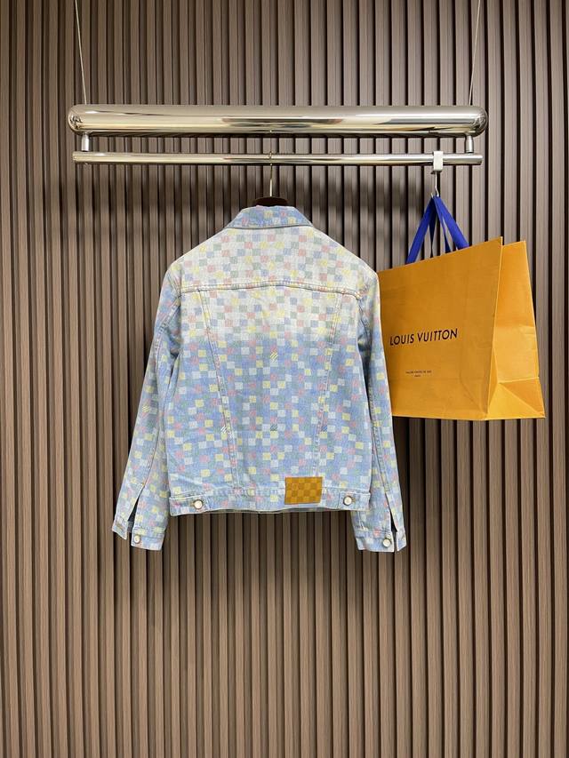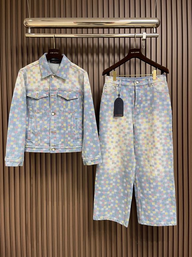 Lv 2025Ss new trucker denim jacket and jeans set. Crafted from washed denim, the Marque L.Vuitton Deposee logo is incorporated into the Vers Der check, subtly recalling the Spring/Summer 2025 runway. The primary color hand-painted print echoes the colorful flags of the UNESCO Roof Garden, while pearlescent buttons add a touch of sophistication. Sizes: S-Xl 29-30-31-32. Sizes run large at the counter.