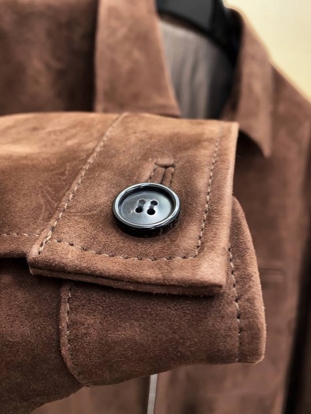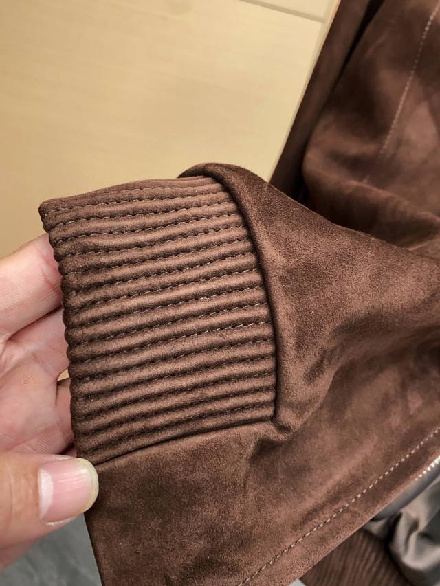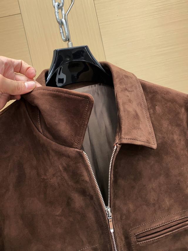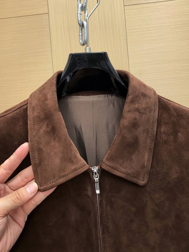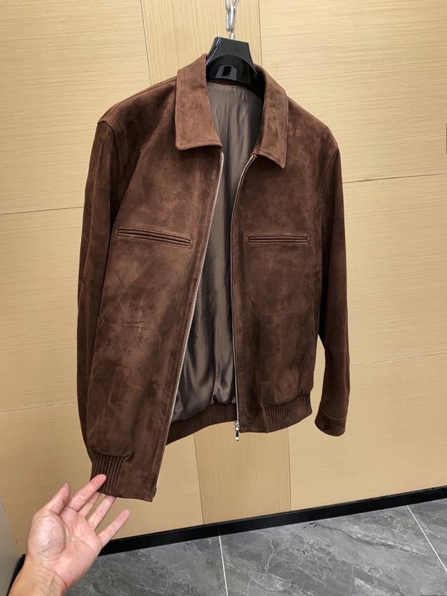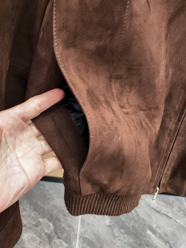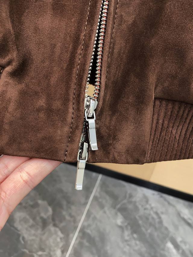 Loro Piana, a top Italian luxury brand acquired by the LVMH Group in 2013. New LP jacket; suede body; 100% imported mixed sheepskin leather, of exceptionally high quality. The outer layer is a thin, lightweight leather with a matte finish, dry texture, and a velvety feel. Upon receiving the jacket, examine it closely; the entire piece, from the fabric and leather to the stitching, is worthy of appreciation, showcasing a subtle yet sophisticated style. This suede bomber jacket exudes a charming retro appeal. The novel and subtle color-changing pattern presents a unique character. The jacket features a shirt collar and wide welt pockets. Embossed lettered logo decorations add a retro touch. Sizes: 48-56 .