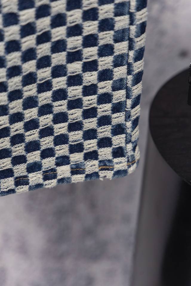 , from the Fall/Winter 25 collection. Featuring an all-over contrasting mosaic checkerboard pattern, the washed denim is richly textured, exuding a refreshing summer vibe. Pearlescent rivets accent the pockets, and a nubuck label rests on the back.