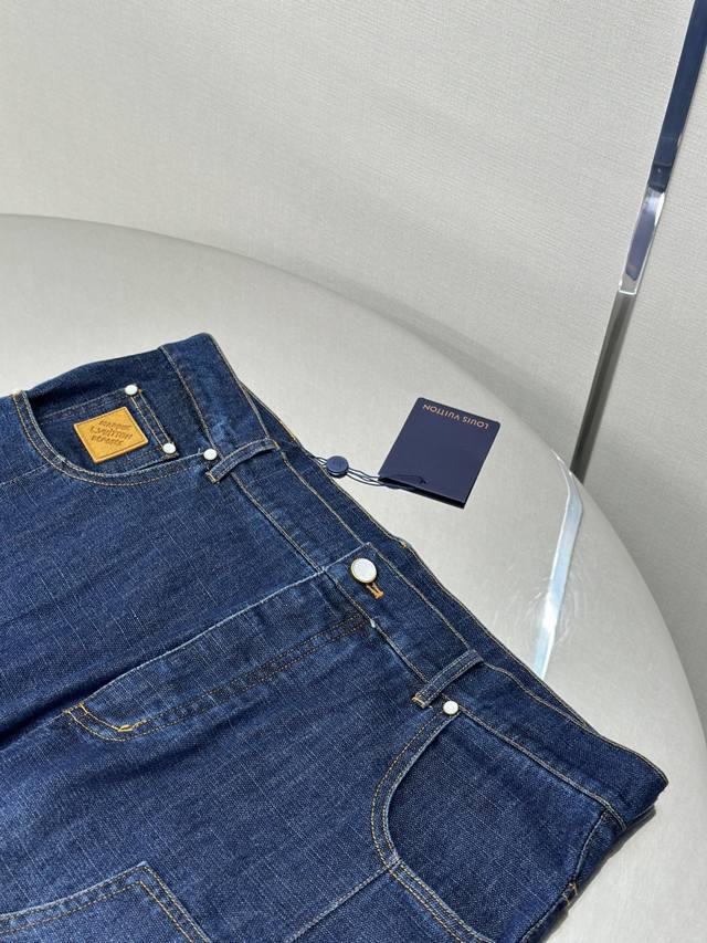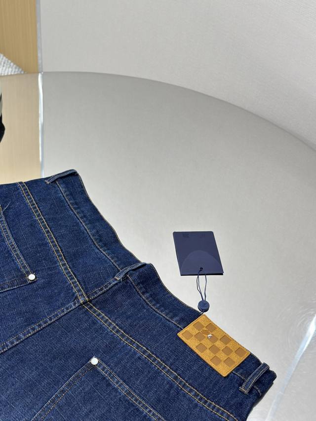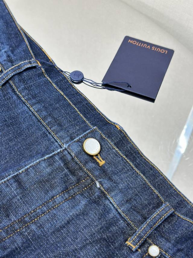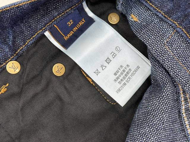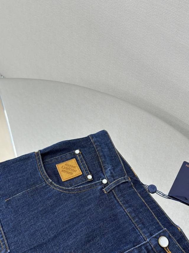 These jeans, from the Fall/Winter 2025 runway, feature washed denim with an epi-grain leather texture. Nubuck leather is accented with patches and a Mini Damier label at the ticket pocket and back, while pearlescent buttons and rivets add a sophisticated touch.