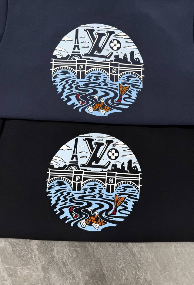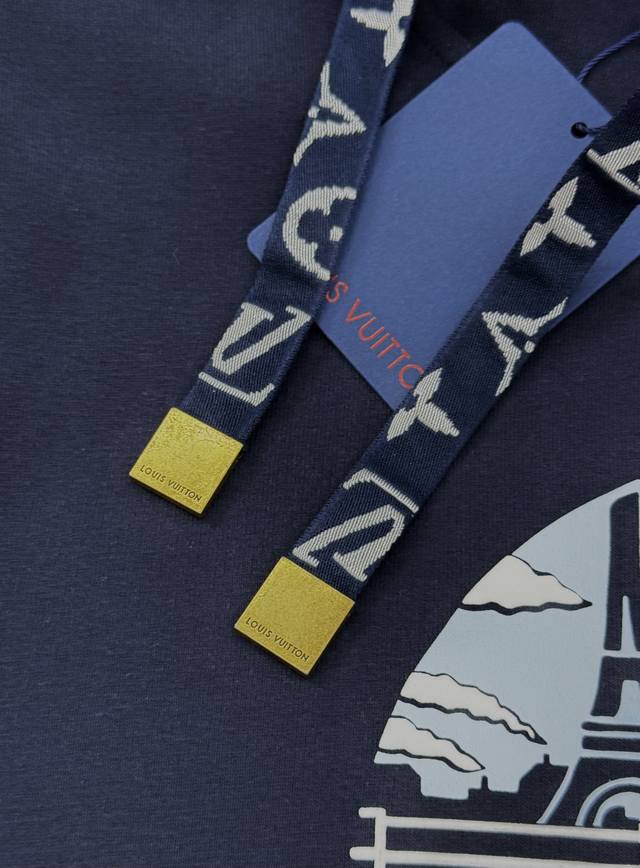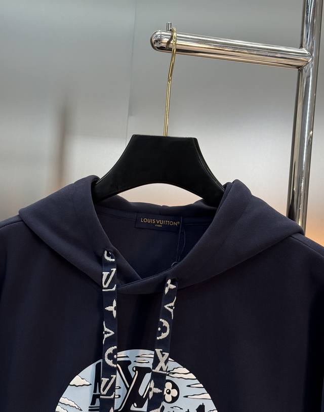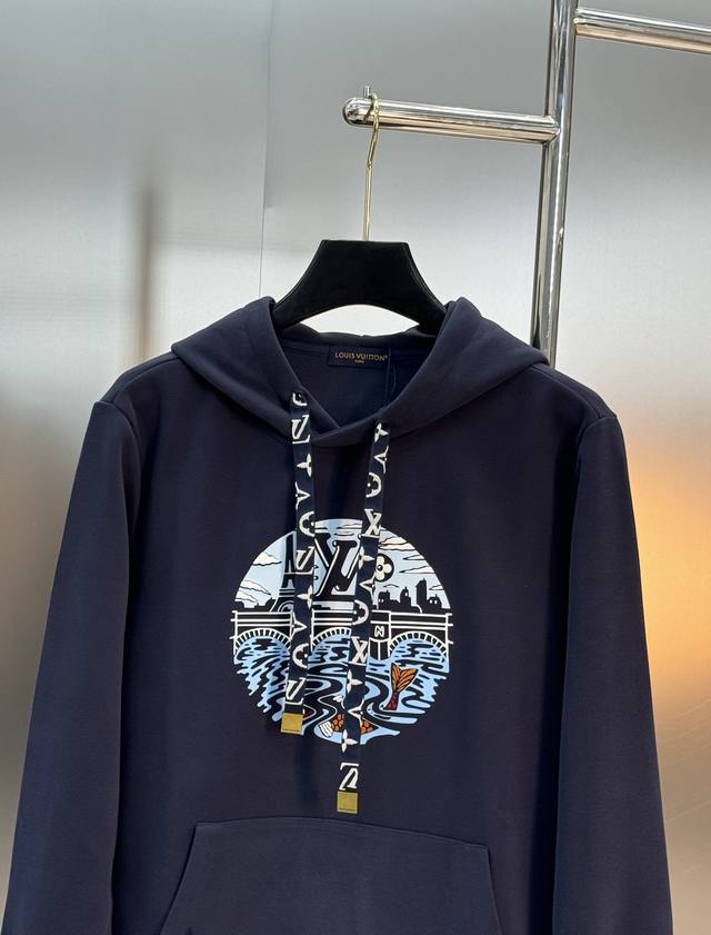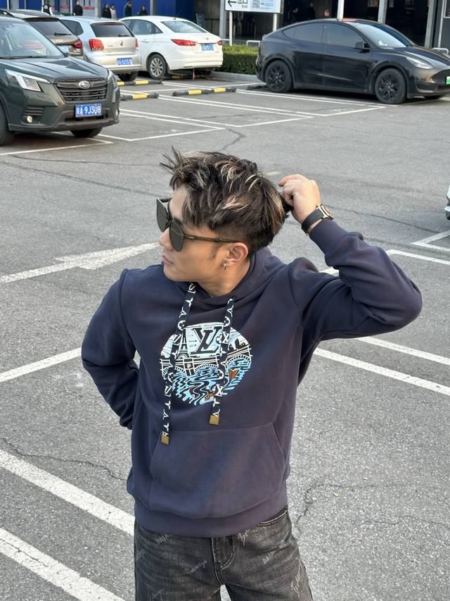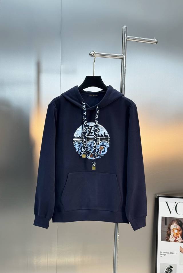 Louis Vuitton Hong Kong Style Printed Hooded Sweatshirt. The main color is a hazy blue with intricate prints, exuding a retro and trendy vibe! Made of thick terry cotton, it's super warm and comfortable for autumn and winter. The loose fit is flattering for all ages. The hooded design is practical and stylish, perfect for everyday casual wear, school outfits, or street style. Pair it with jeans or sneakers for an effortlessly chic Hong Kong style! Colors: Navy Blue, Black. Sizes: M-3XL. Recommended size: L for someone 175cm tall and weighing 140kg.