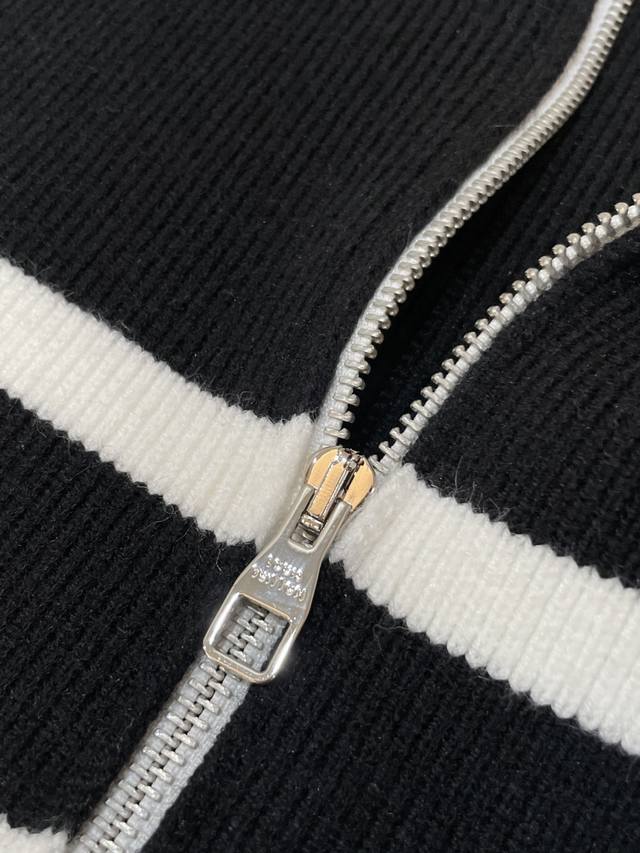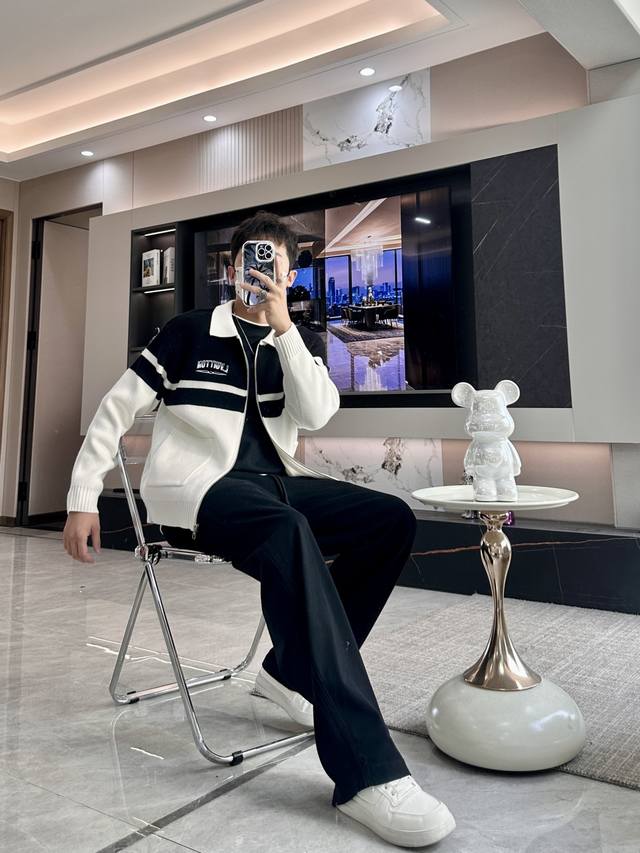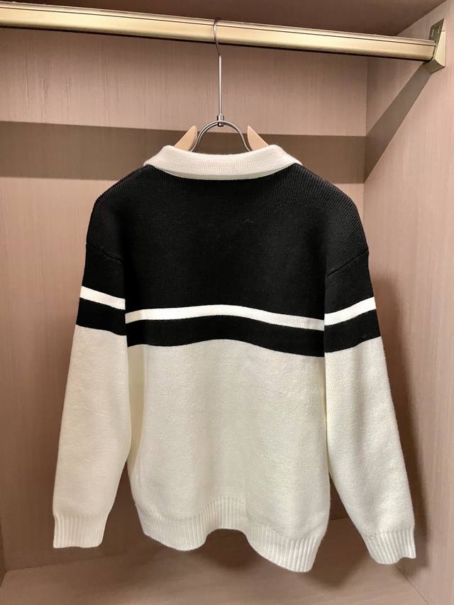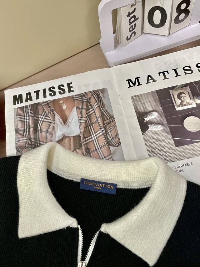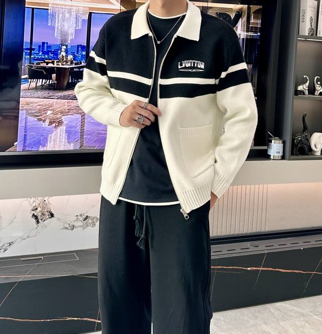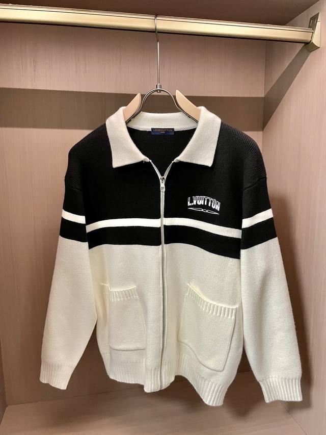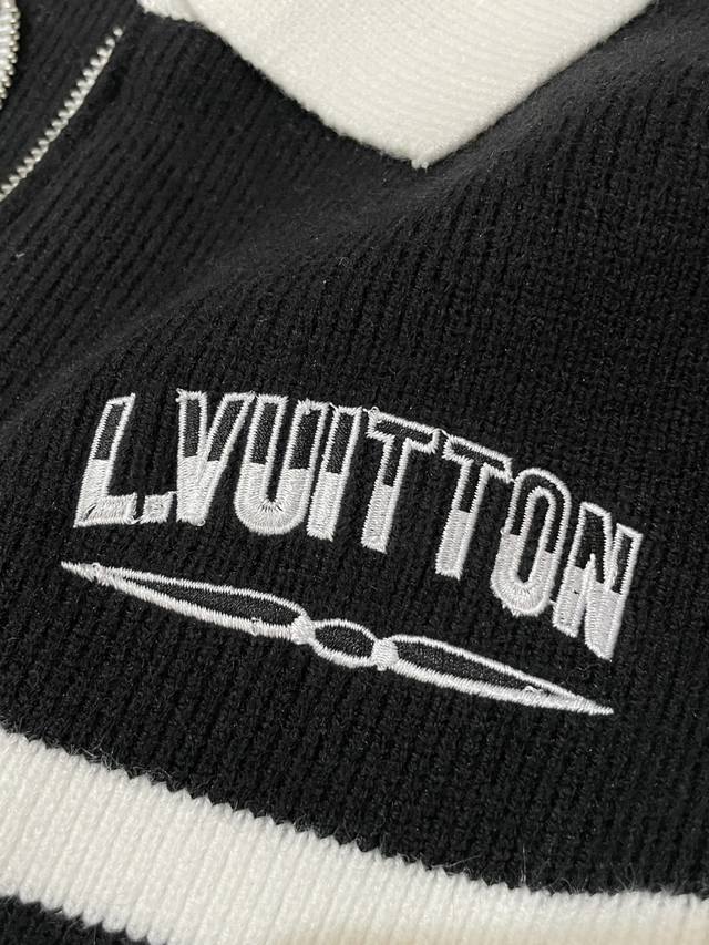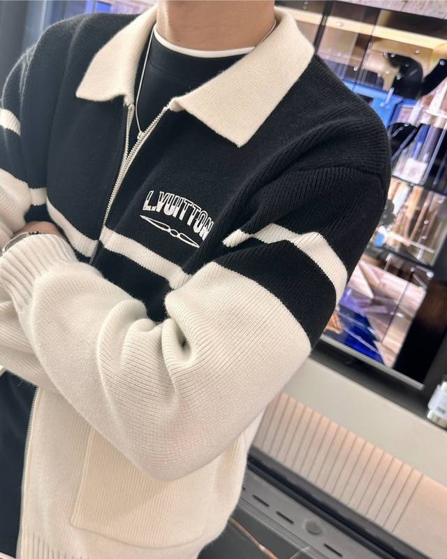 Louis Vuitton's Fall/Winter 2025 collection: An elegant reimagining of sporting aesthetics. Design narrative: A contemporary interpretation of vintage sporting spirit. This knitted jacket draws inspiration from 1970s racing jerseys, infusing Louis Vuitton's classic black and white color palette with modern tailoring. The handwritten logo embroidery and double stripes on the chest create a visual focal point, reminiscent of the rhythmic straps of the brand's early luggage.