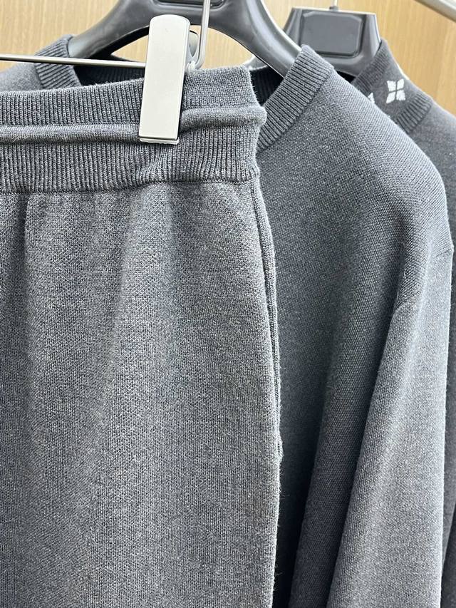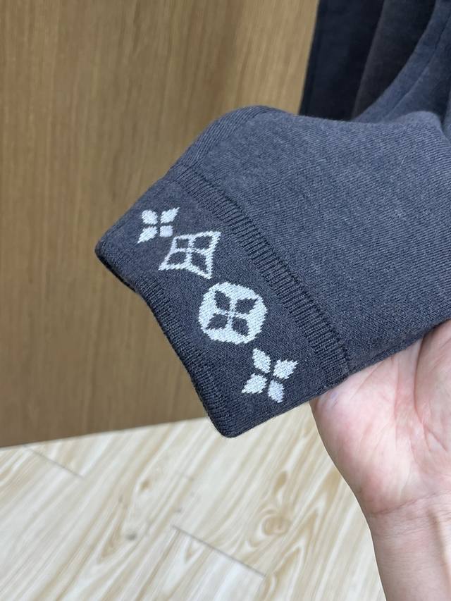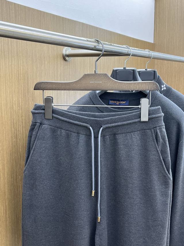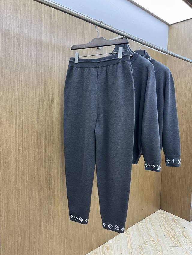 Louis Vuitton's new Fall/Winter 2025 suits. Classic logo-lettered wool suits, featuring premium quality and top-tier hardware. These double-faced wool knit trousers feature a soft cotton lining and Monogram jacquard detailing at the cuffs, offering both comfort and elegance. Pair with the matching waistcoat jacket for a sophisticated travel look. Color: Gray. Sizes: S-Xxl.