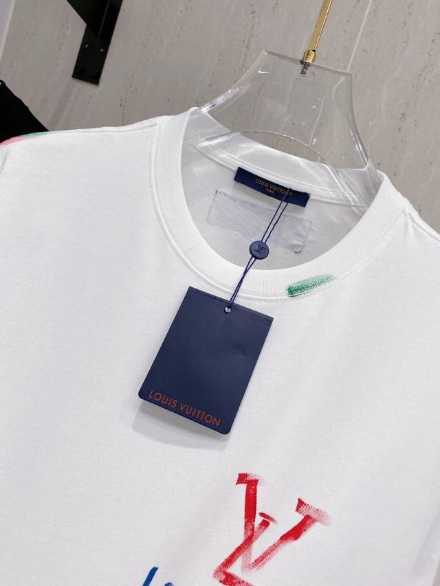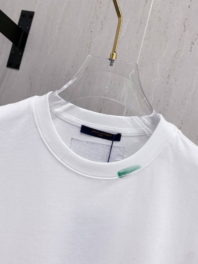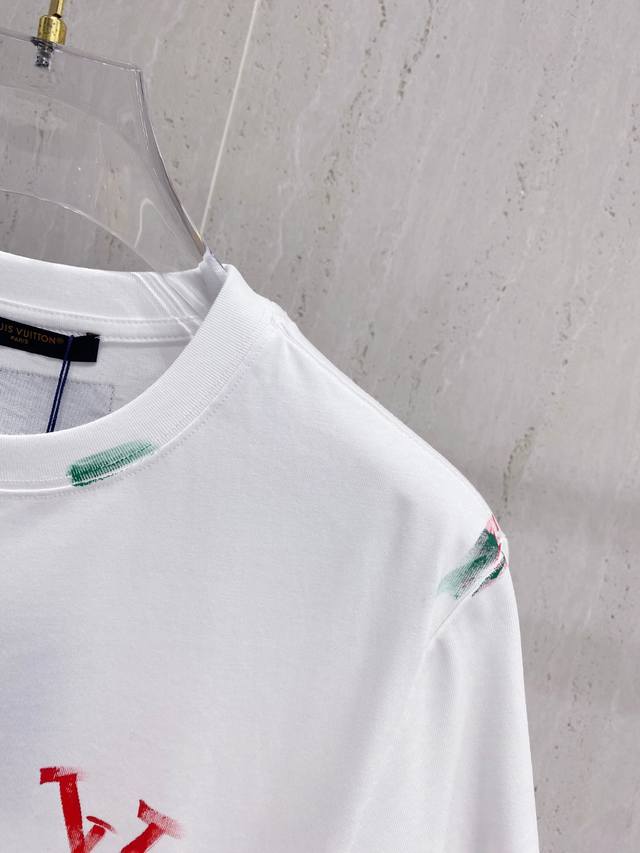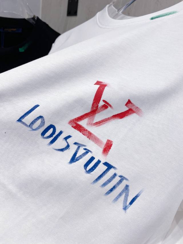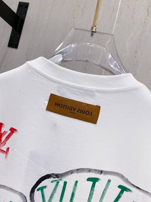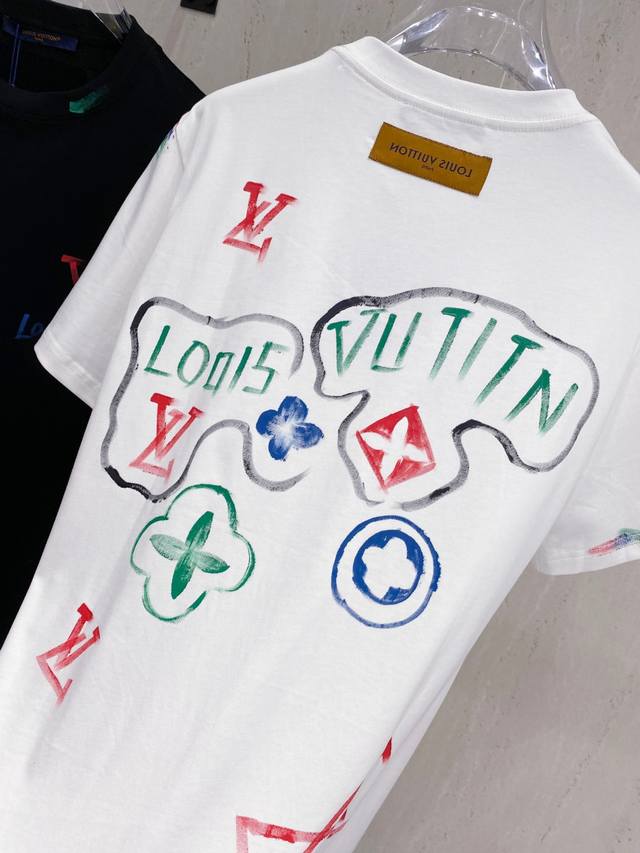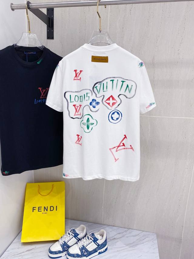 Louis Wei*1V 25Ss Spring and Summer new model first release counter latest short-sleeved round neck T-shirt hand-painted high-end custom design avant-garde fashion! Brand Logo heavy craftsmanship design, high-end custom fabrics, soft feel, comfortable to wear, customer-supplied imported high-end fabrics with very delicate texture, exquisite details and exquisite craftsmanship, counter-level exquisite sewing, fine workmanship, a highly plastic single product, any fashion can be matched, the version is super good, a must-have for trendy men