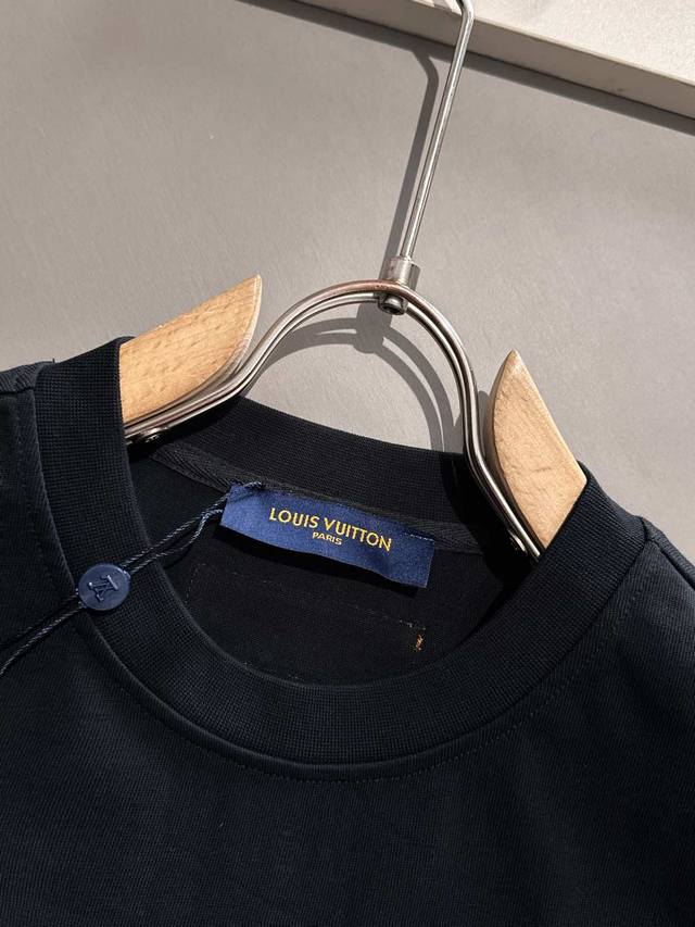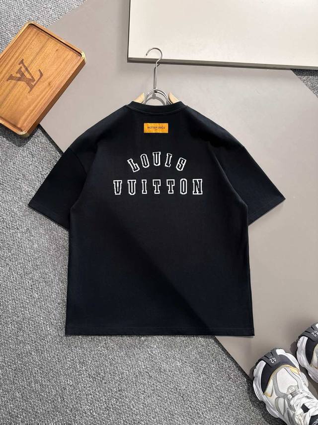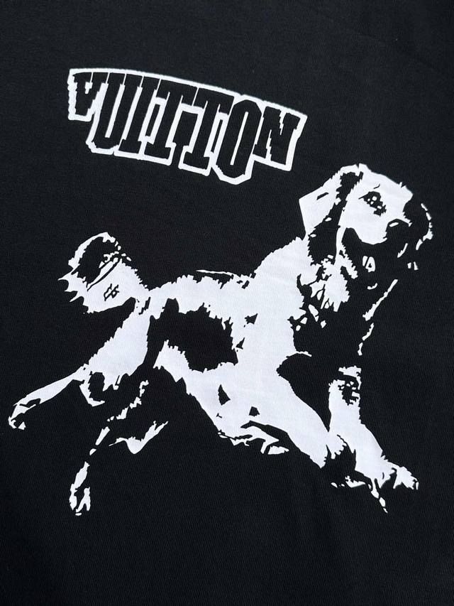 This cotton T-shirt is inspired by the dog walkers in Westminster, with a humorous Wdog badge on the front, embellished with embroidery and beads, and a handwritten Louis Vuitton logo on the back embroidered with eye-catching yarn.
