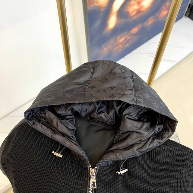 Lv, 2025 Fall/Winter new hooded jacket. This black hooded jacket is crafted from a 60% rayon, 35% polyester, and 5% spandex composite fabric, combining the skin-friendly breathability of rayon with the precise elasticity of spandex. A square logo on the left chest serves as a subtle branding, while subtle totem patterns on the sleeves and pockets continue the brand's DNA. The lining is made of 100% polyester, ensuring a smooth fit. Endless styling possibilities will reshape your urban wardrobe. Size 48-56. Model is 173cm tall, 143kg, and wears a size