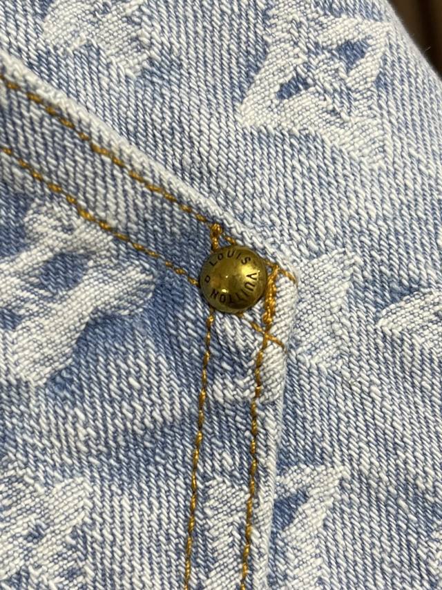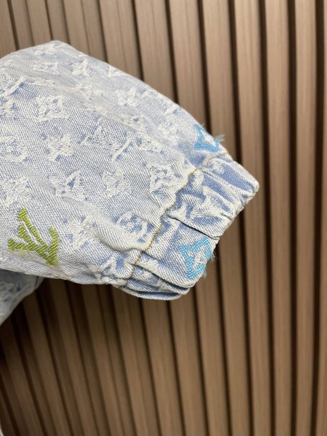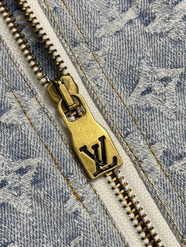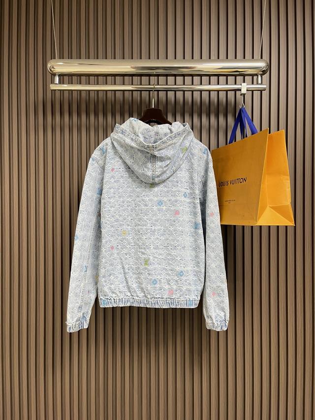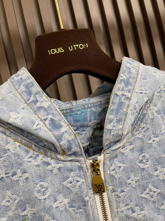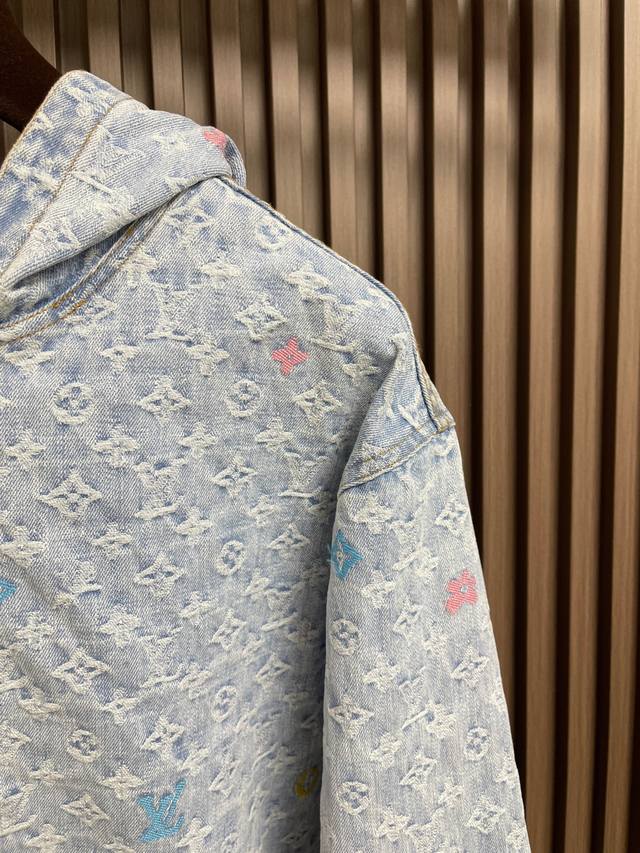 Lv 2025Fw autumn and winter new light blue washed hooded denim jacket, all-over Monogram Craggy jacquard with cut-out details, metal zipper closure, elastic sleeves and hem, large slanted pockets, slightly loose fit, unisex style. Sizes: S-Xl