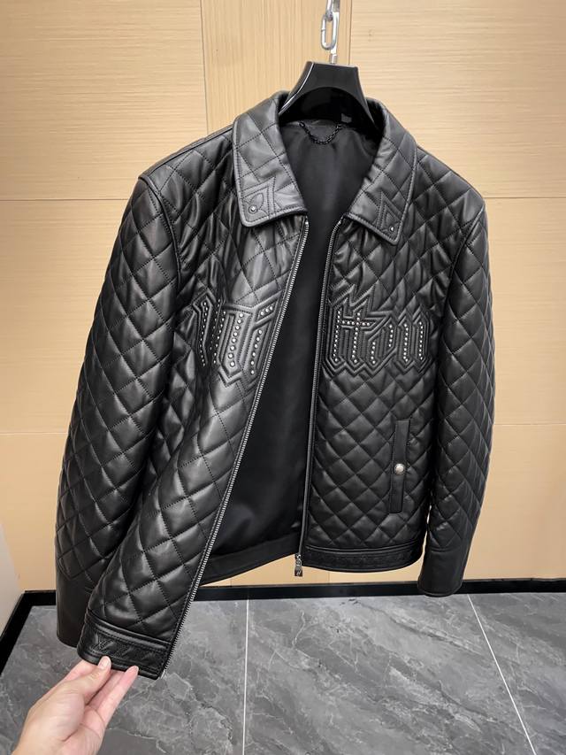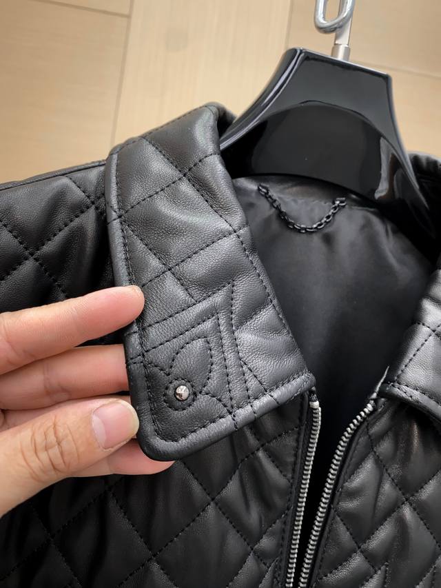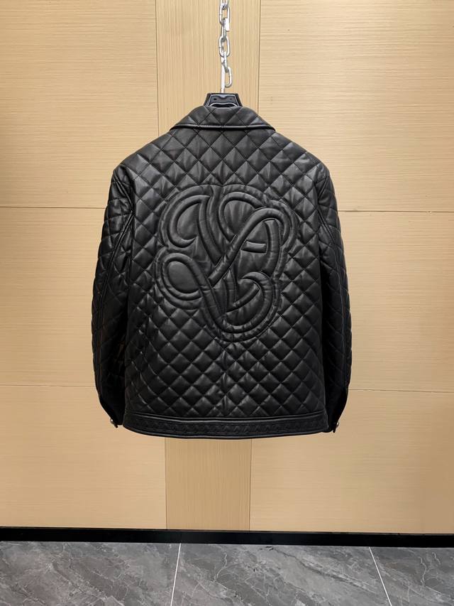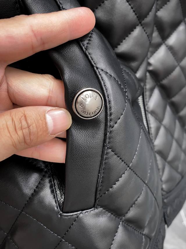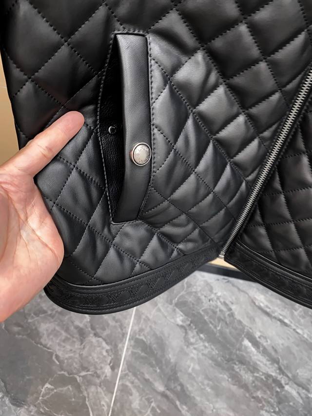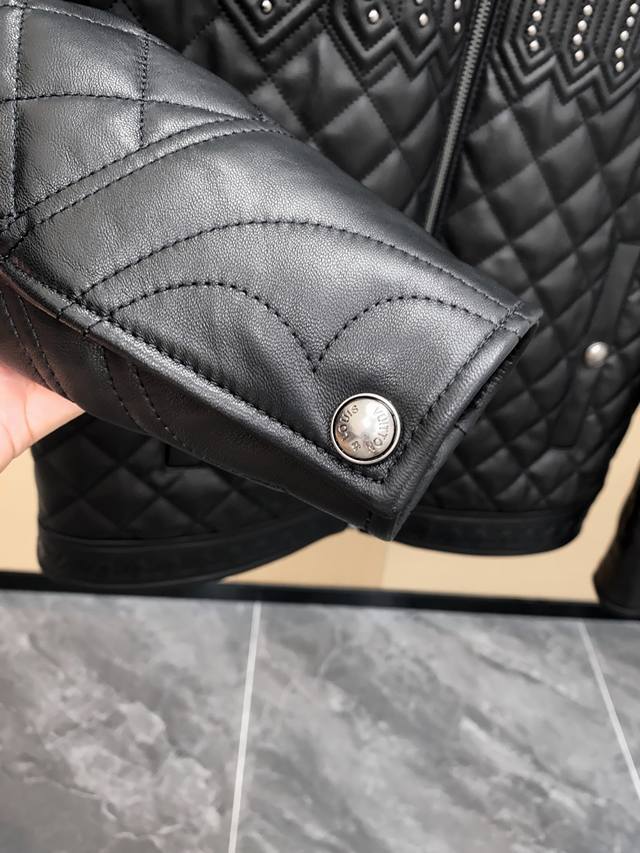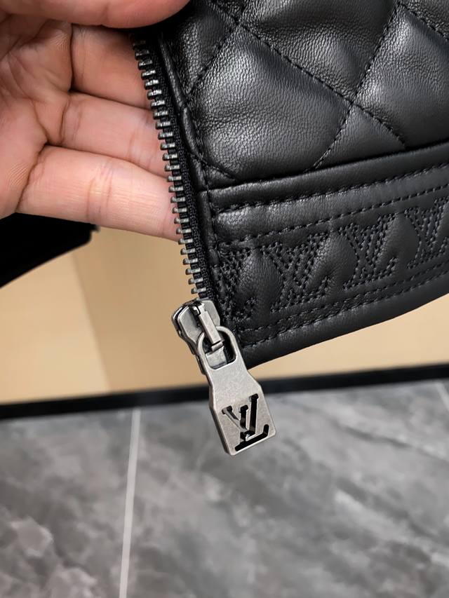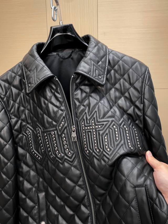 LV 25Fw Men's Nappa Leather Biker Jacket with LV Logo Beading This black Nappa l