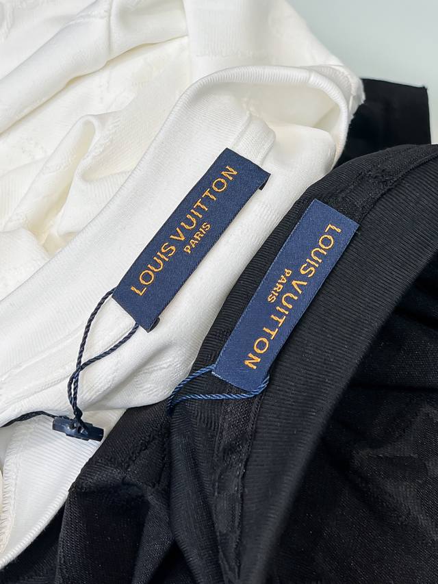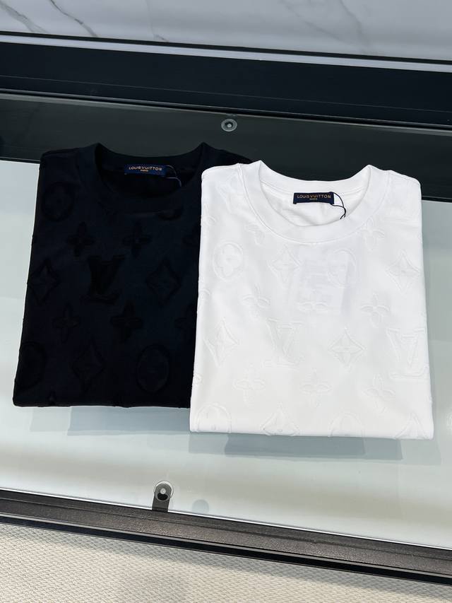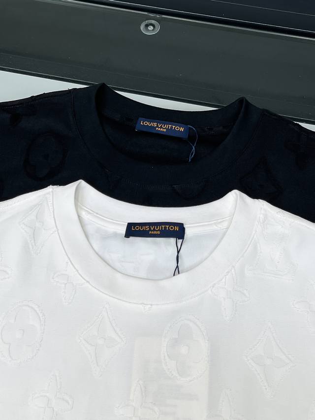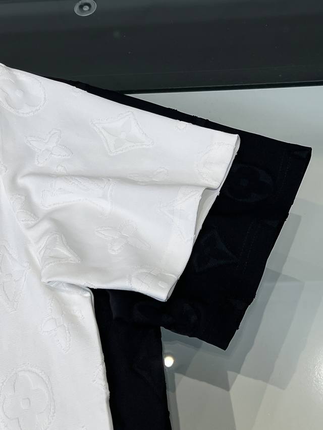 LV 26Ss New All-Over Print Monogram Short-Sleeve T-Shirt Ddd This white T-shirt uses a special jacquard process to present the classic LV monogram pattern in three dimensions on the fabric surface. The fabric is specially treated to present a delicate embossed texture, with each letter and pattern clearly defined and three-dimensional, offering a rich tactile experience. The round neck design fits the neckline perfectly, with a clean cut and a simple and elegant overall silhouette. The jacquard process, through precise weaving control, integrates the pattern with the fabric, maintaining visual depth while ensuring wearing comfort. The stitching on the garment is even and neat, ensuring a sturdy structure that is not easily deformed. The hem and cuffs are smoothly finished with clean and crisp edges, showcasing exquisite craftsmanship. The overall design is understated yet luxurious, combining classic monogram elements with modern tailoring, making it suitable for everyday wear while showcasing quality and taste in the details. The stitching is straight and delicate, the fabric is comfortable and soft, and the color is consistent with other items to create a stylish look. Suitable for various occasions, it features custom-made accessories, all three labels are included, and it's unisex! Sizes: S-2XL