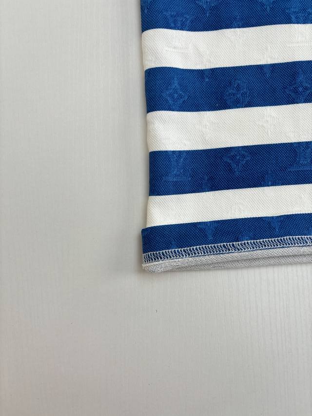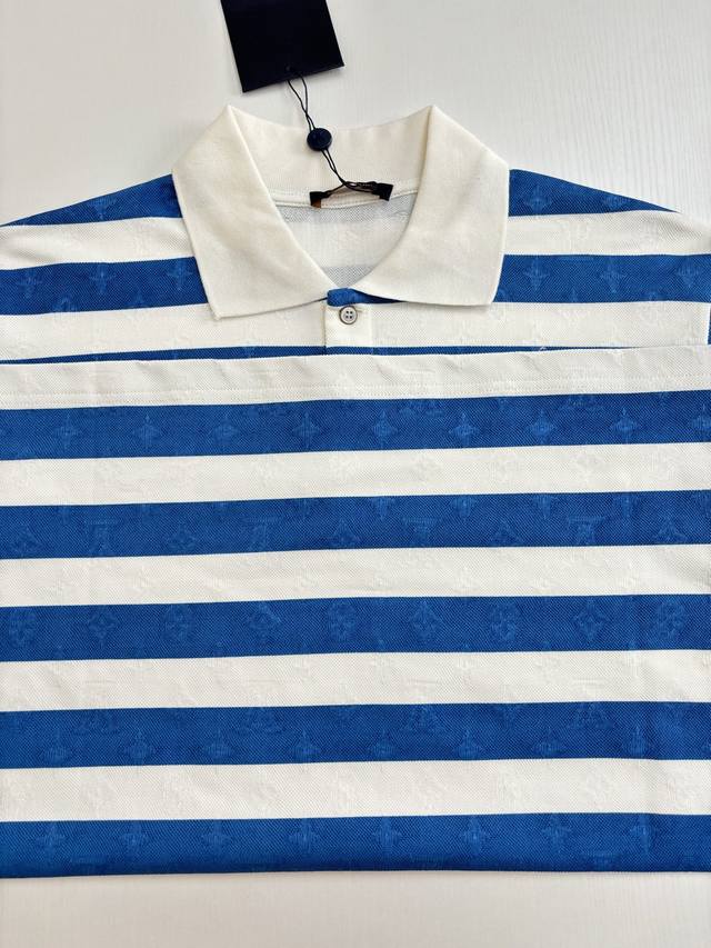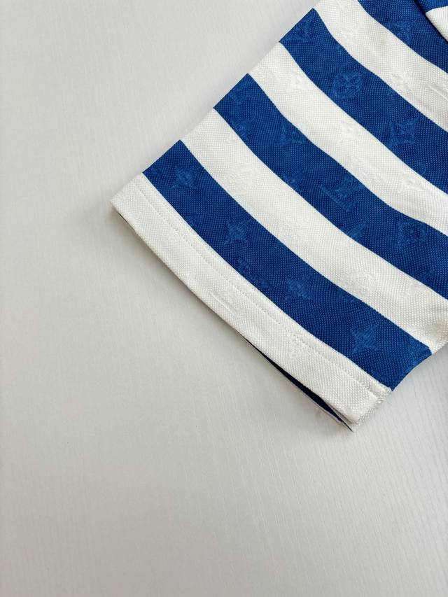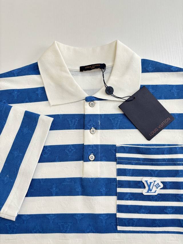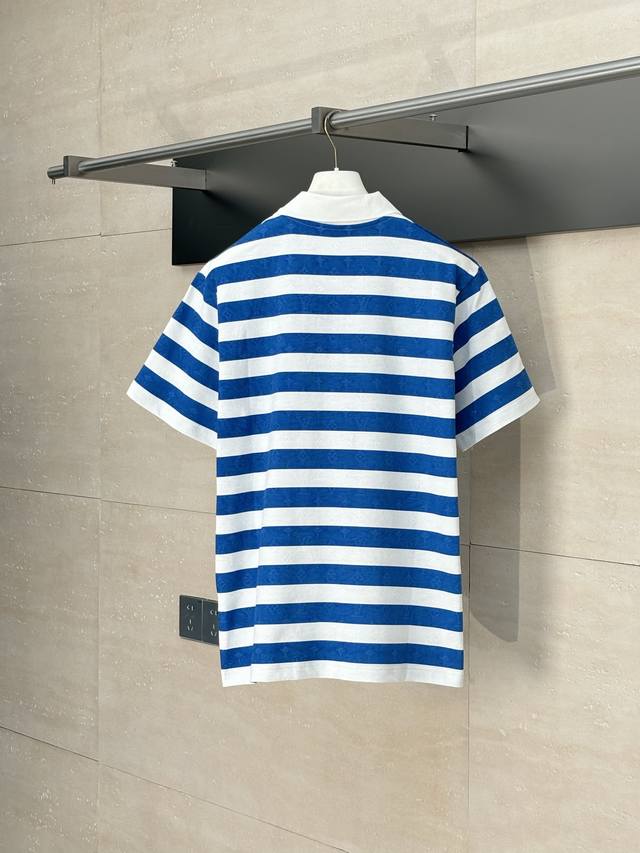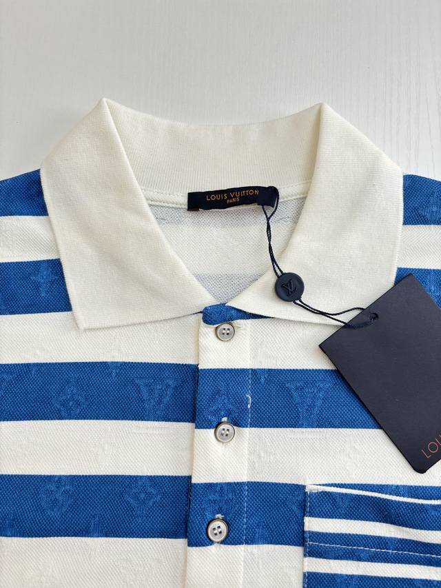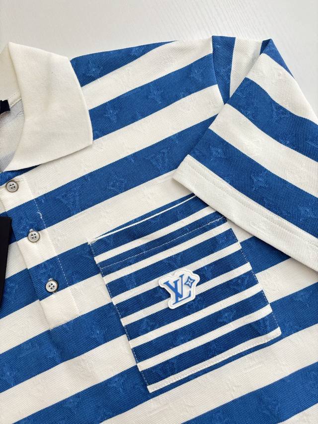 LV* Louis 25Ss New Knitted Collared Short-Sleeve Polo Shirt DDD Made of custom-made fine pique cotton fabric, Monogram jacquard base with blue and white contrasting stripes, slightly thinner striped patch pocket on the chest, rubber Lv Charm appliqu