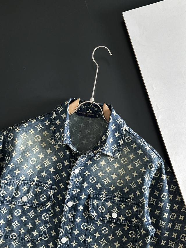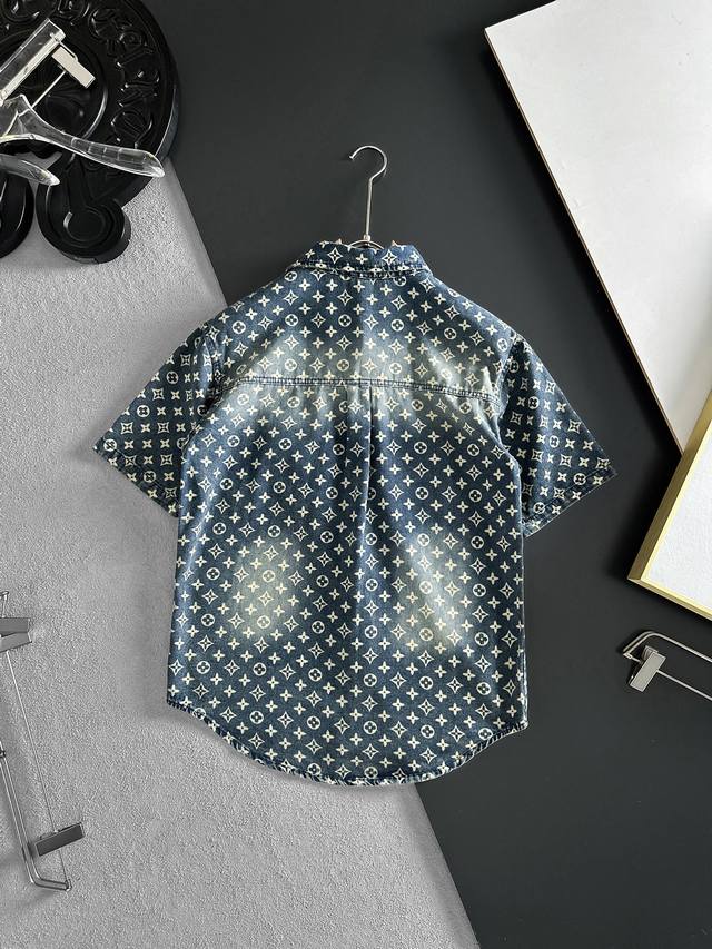 Lv Louis Vuitton short-sleeved shirt-style denim jacket. Made from imported denim fabric with jacquard logo and heavy wash, this shirt-style jacket is embellished with hardware buttons for a crisp, stylish look. This unique angle creates a new and versatile look for every style! Sizes: M-3Xl