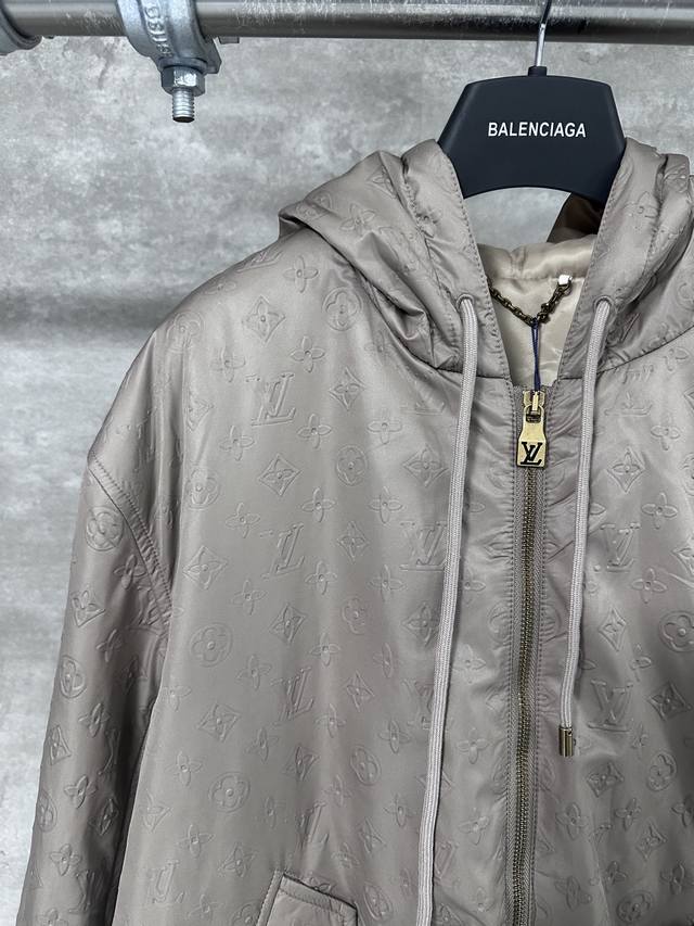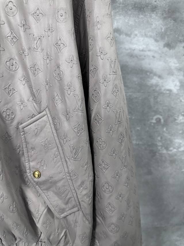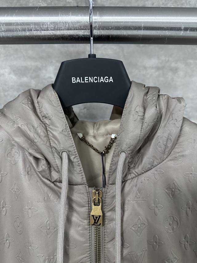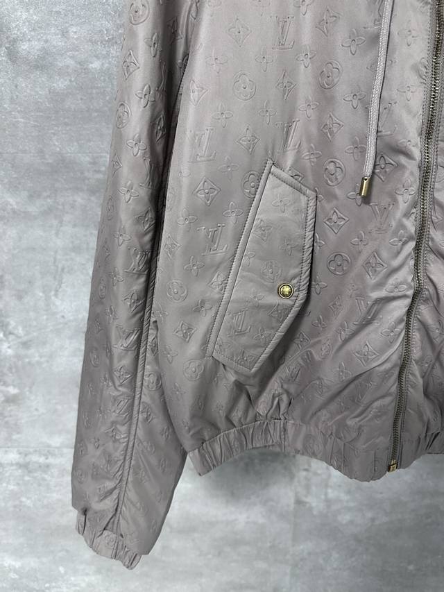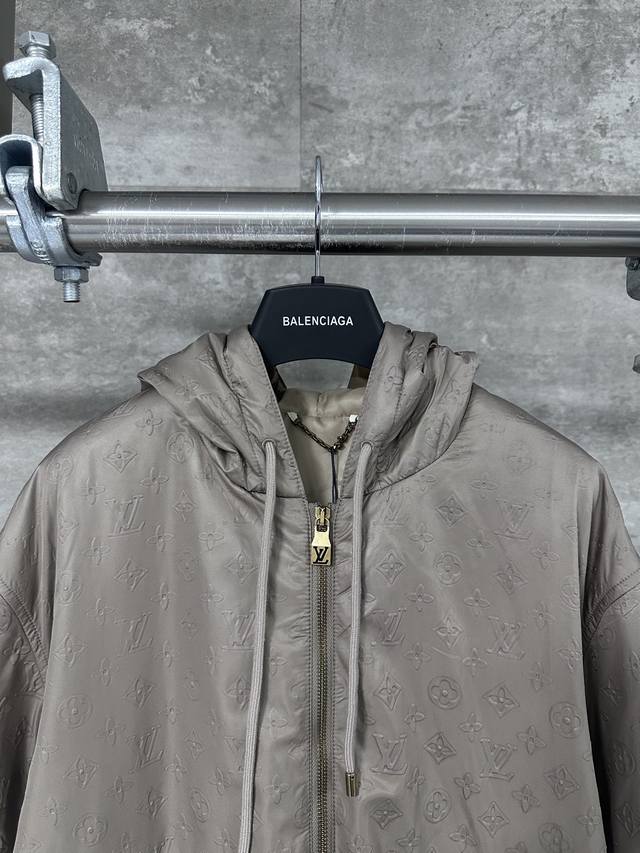 Lv Louis Vuitton's all-over embossed logo jacket. This new hooded windbreaker, featured on the Spring/Summer 2025 runway, reimagines the classic outerwear design, infusing the all-over Monogram embossed pattern with elegant hues. Lightweight padding and a silky lining enhance comfort, adding a modern touch to everyday looks.