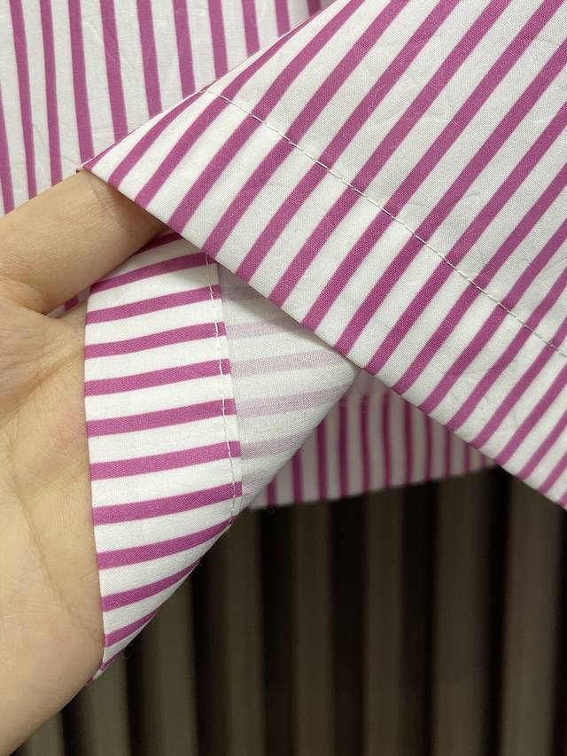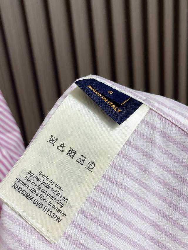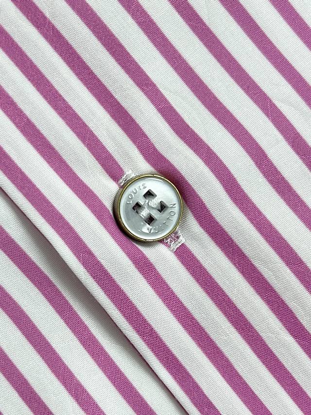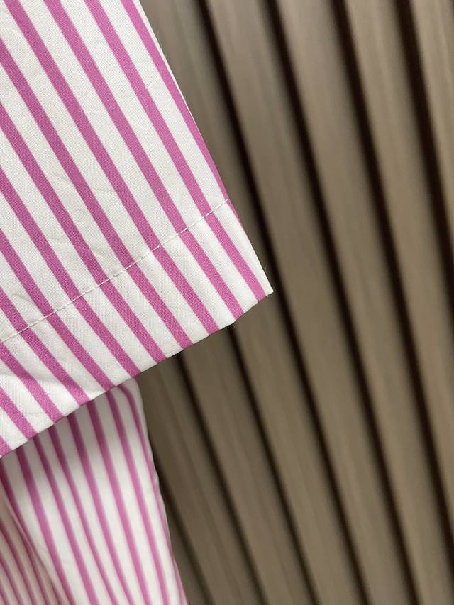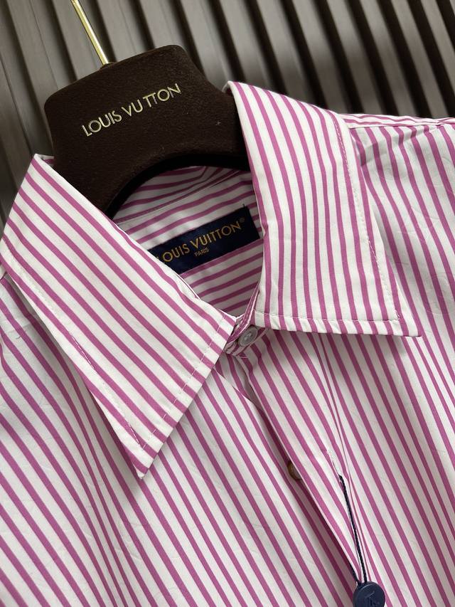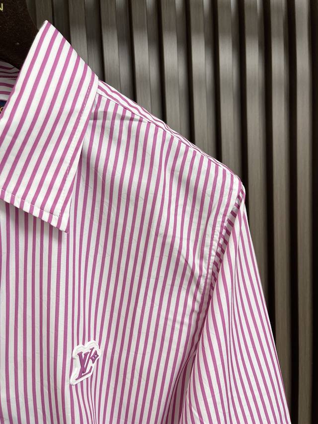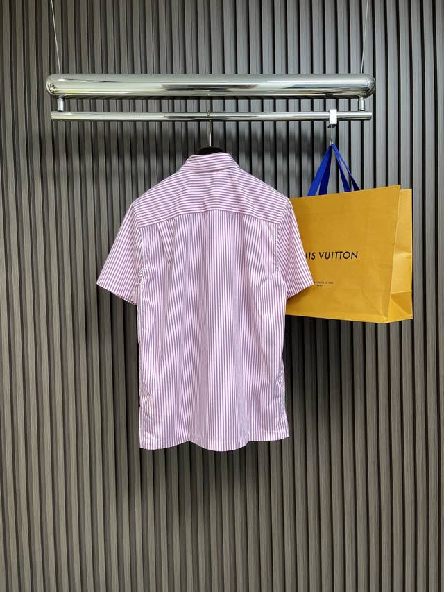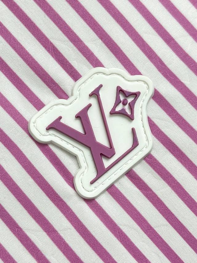 Lv Striped contrast short-sleeved shirt, made from 100% high-quality cotton, with a soft and comfortable texture. The fabric uses classic Monogram jacquard as the base pattern, with a vivid striped print superimposed on the surface, creating a unique visual layering. It adopts a standard version design with an exquisite peak collar shape, and the details use pearlescent buttons with a metal base, highlighting the brand's exquisite craftsmanship. The specially designed Flower rubber patch on the chest is the finishing touch, highlighting the brand logo and adding a three-dimensional texture to the overall look. This can be perfectly paired with striped items from the same series to create a layered look. The fabric has been specially treated to ensure a crisp and stylish wear while maintaining the natural breathability of cotton. Every detail has been carefully considered, from jacquard weaving to printing process to embellishment, all reflecting the ultimate pursuit of quality. Sizes: S-Xl