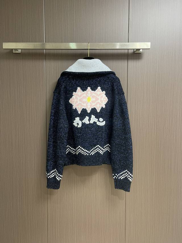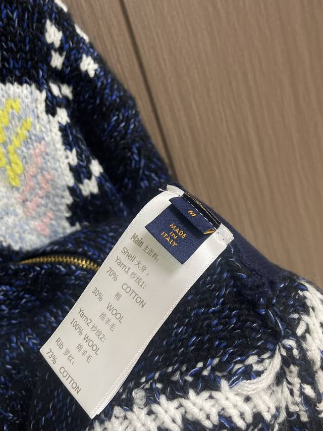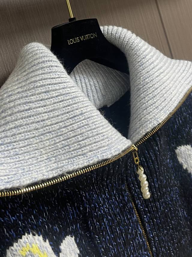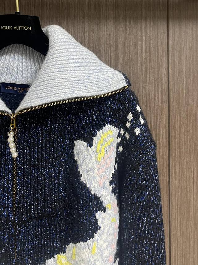 Lv X Nigo zippered knitted belted jacket. This belted jacket captures the creative vision created by Pharrell Williams and Nigo for Fall/Winter 2025. A koi carp adorned with the Lv logo swims across the front, while cherry blossoms and Japanese script behind the logo reflect Nigo's cultural roots. The sophisticated pattern is intarsia-embroidered and embroidered onto the cotton-wool blend knit, creating a delicate, handcrafted look. A beaded zipper pull adds an elegant touch to the comfortable silhouette. Sizes: S-Xl