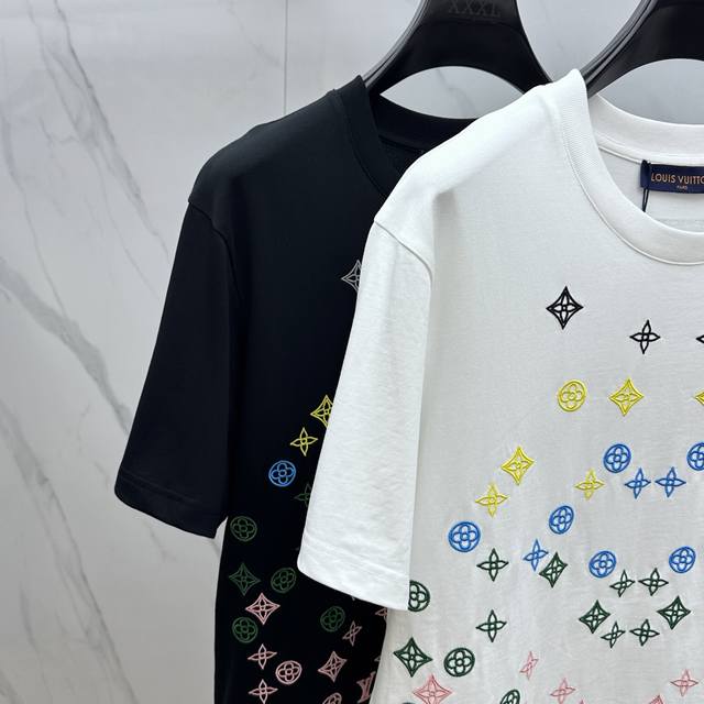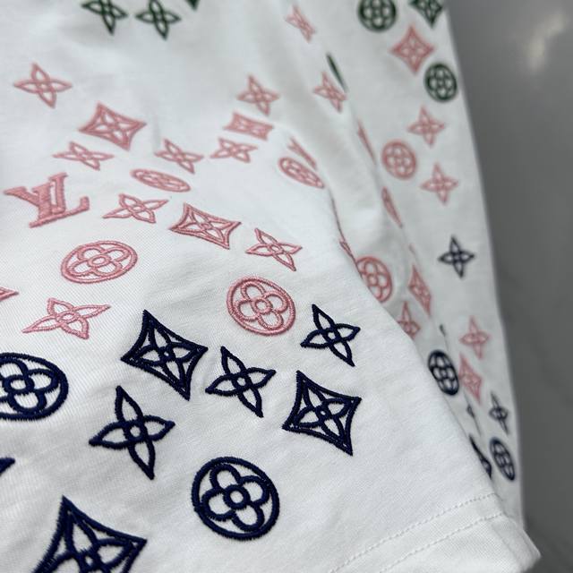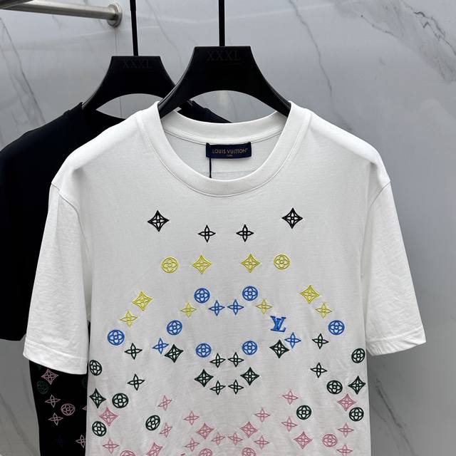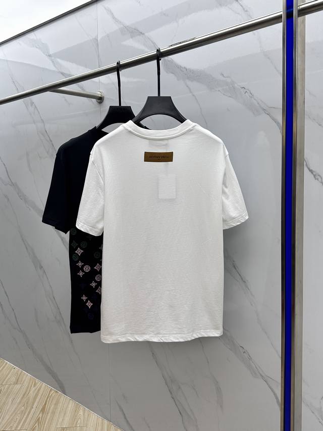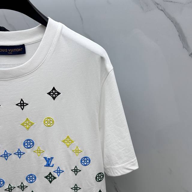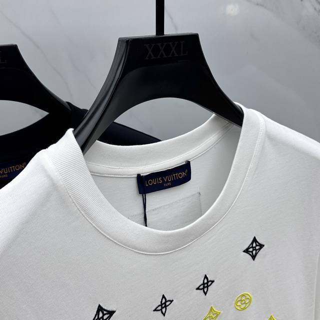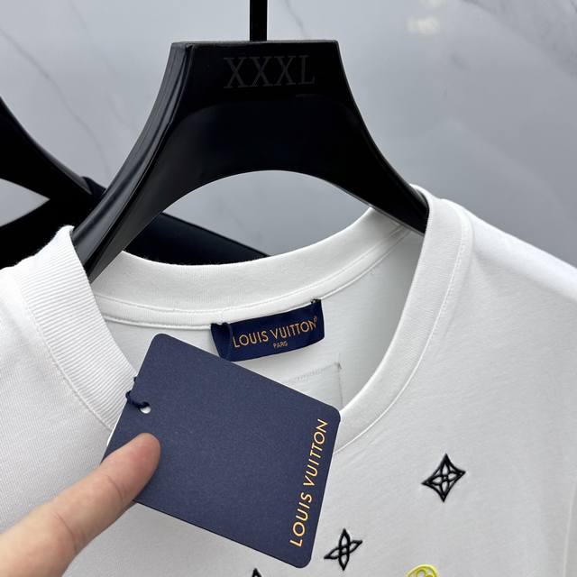 Lv*Louis Vuitton 2025 Spring/Summer new models, the latest short-sleeved round neck T-shirt, high-end custom design, avant-garde fashion! Brand Logo embroidered all over, heavy craftsmanship design, high-end custom long-staple cotton fabric. Soft to the touch. Comfortable to wear. Exquisite stitching at the counter level. Fine workmanship. The upper body effect is invincible and handsome! A must-have item for men!