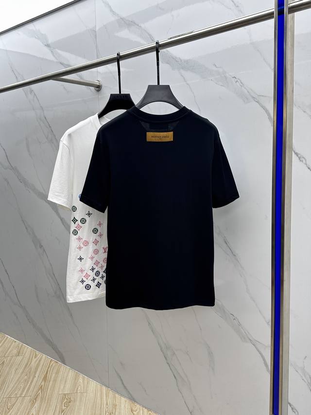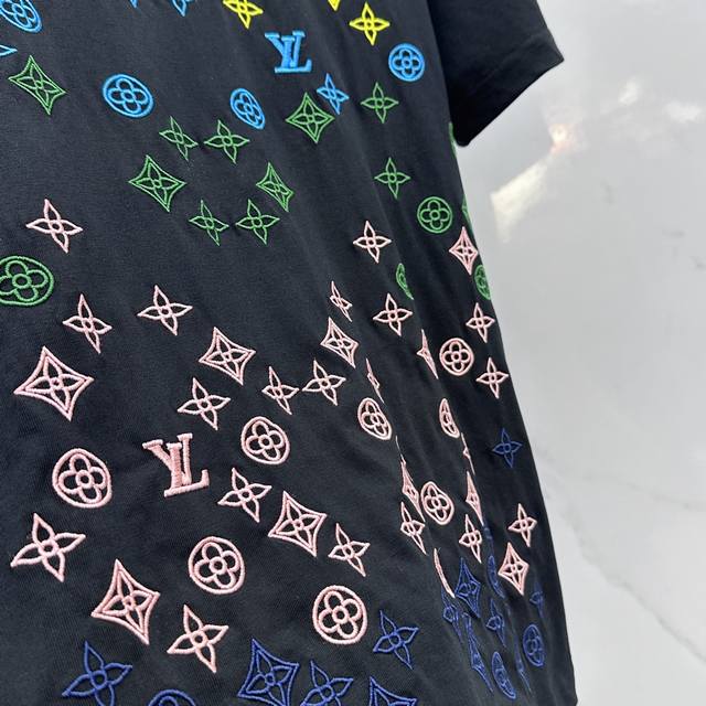 Lv*Louis Vuitton 2025 Spring/Summer new models, the latest short-sleeved round neck T-shirt, high-end custom design, avant-garde fashion! Brand Logo embroidered all over, heavy craftsmanship design, high-end custom long-staple cotton fabric. Soft to the touch. Comfortable to wear. Exquisite stitching at the counter level. Fine workmanship. The upper body effect is invincible and handsome! A must-have item for men!