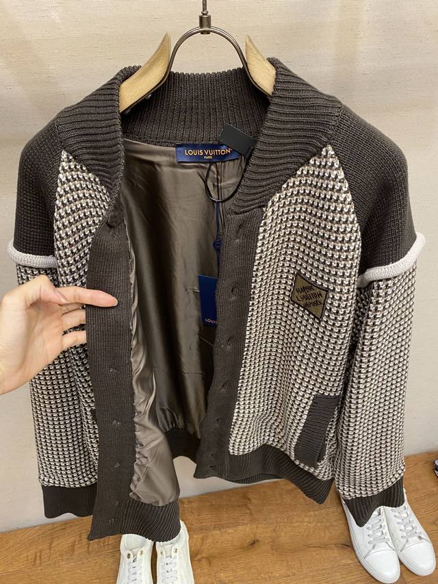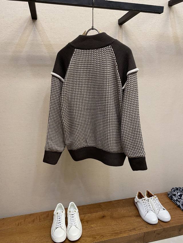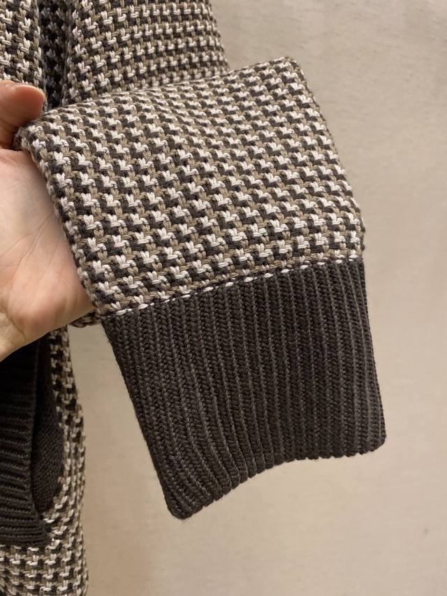 p 1V, Jacquard 3D Bomber Check Sweater. Fabric: 100% cotton wool, 100% rayon lining.