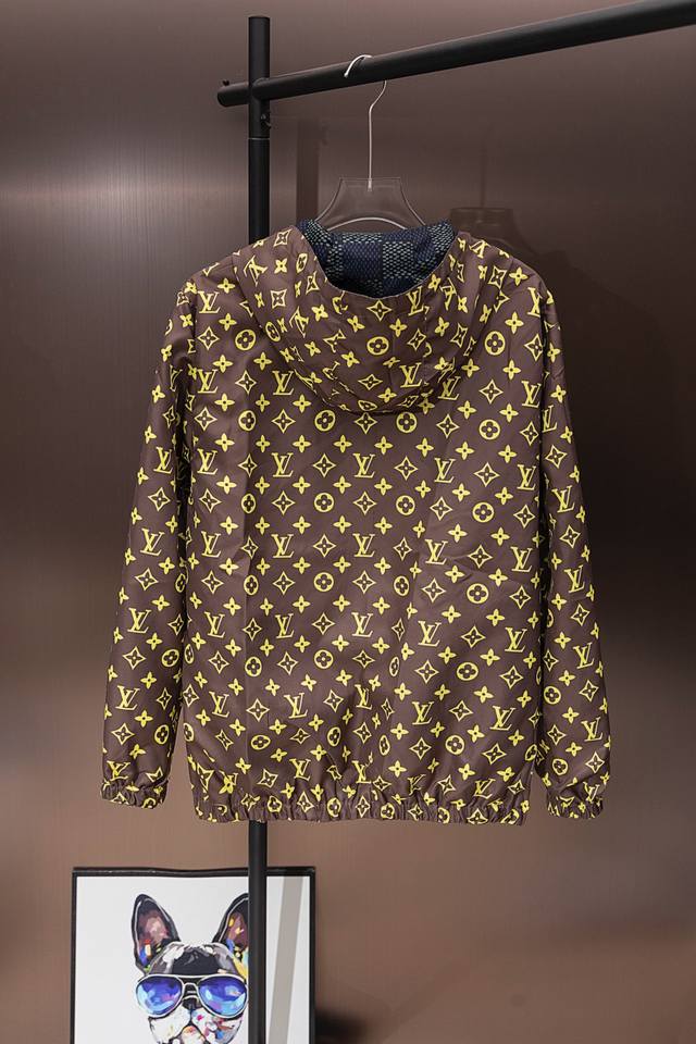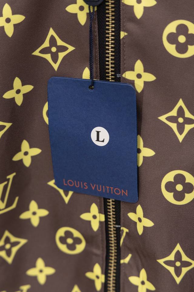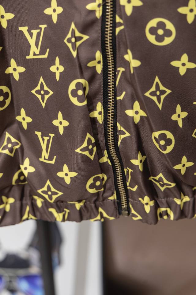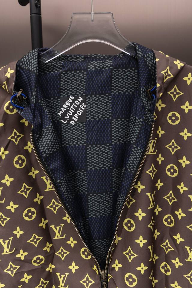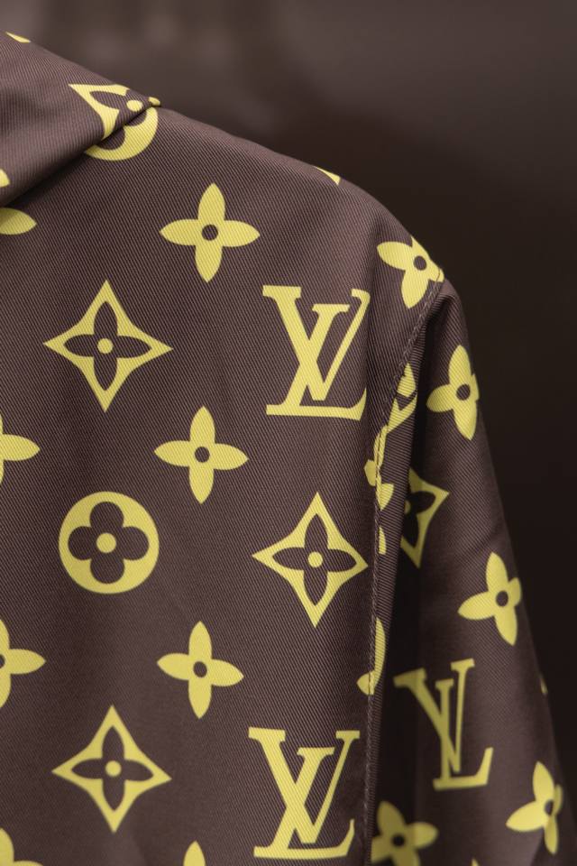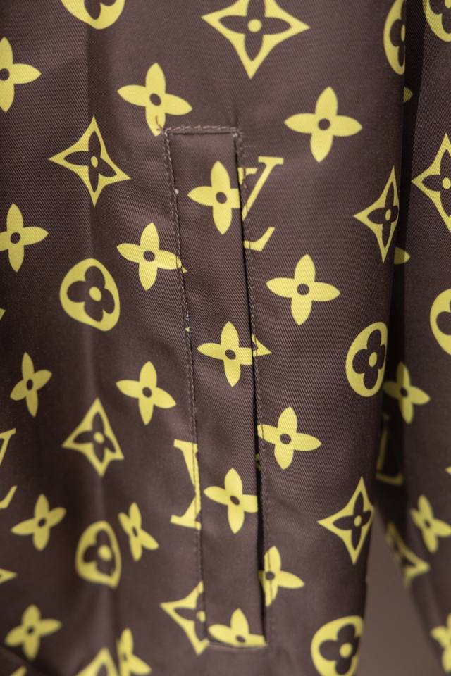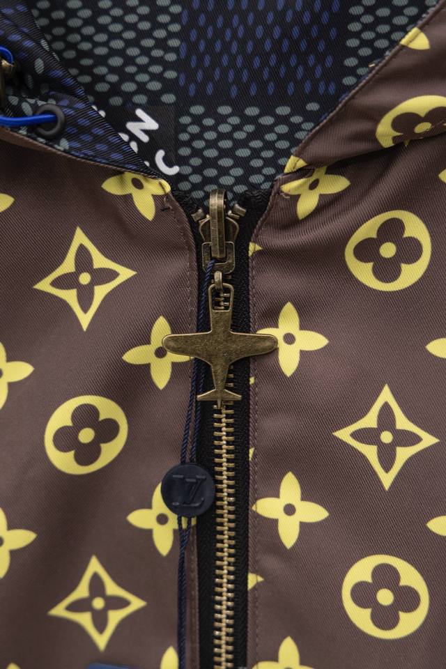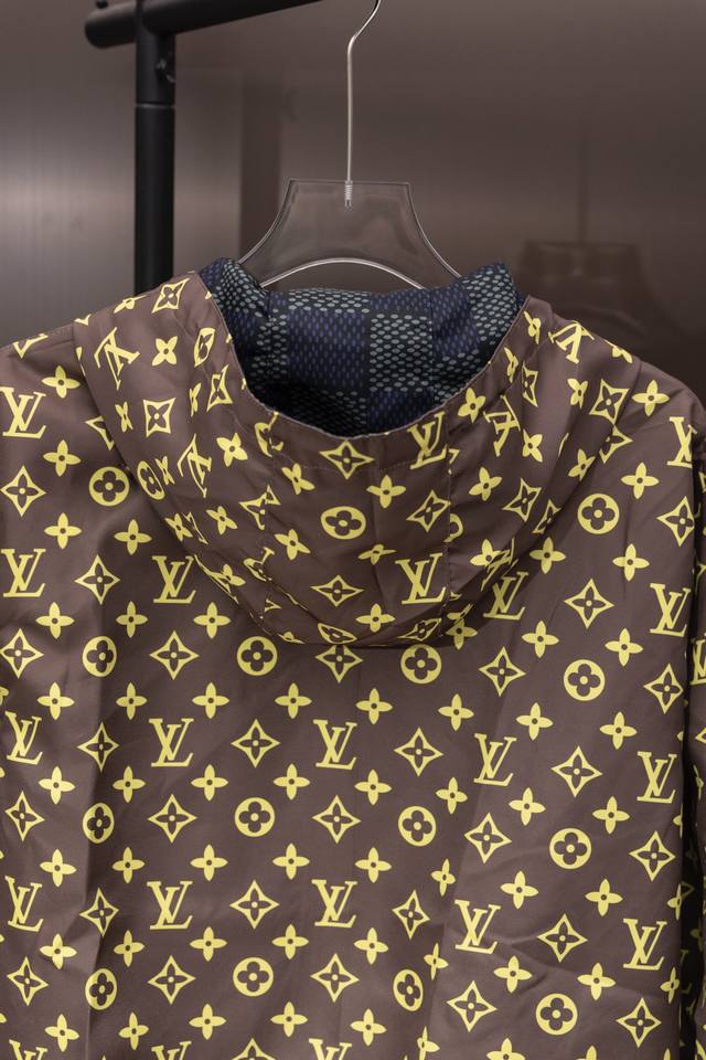 This patterned reversible trench coat is from the Spring/Summer 2025 fashion show. One side uses vibrant blue and green tones to showcase Damier's modern style. The other side uses the brand's traditional brown color and is engraved with the Monogram pattern.
