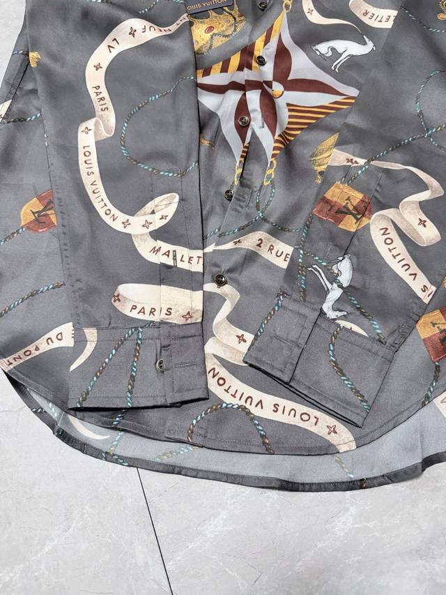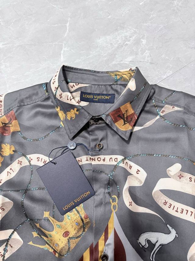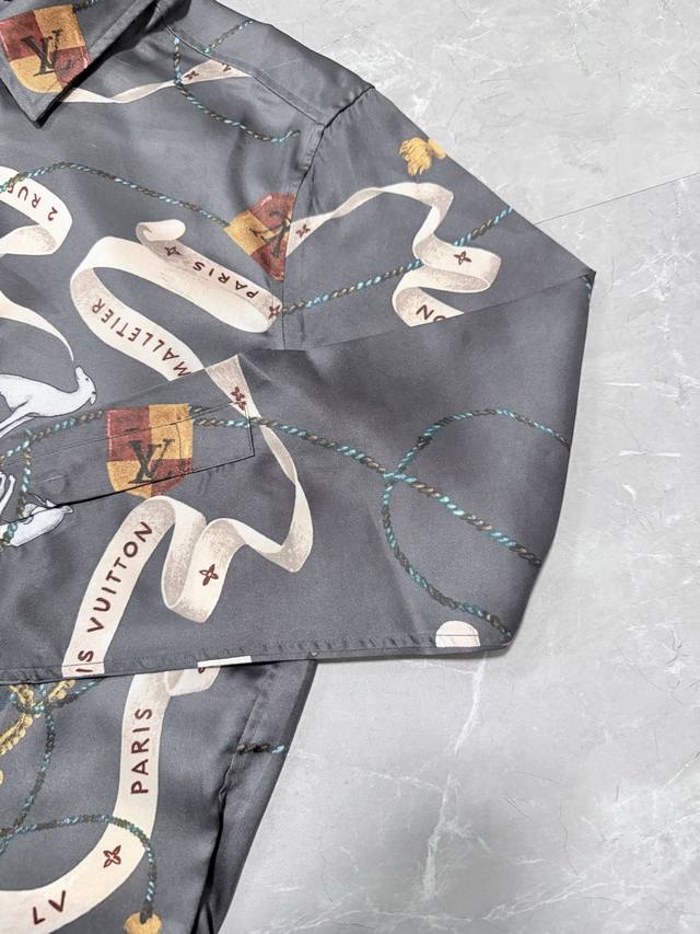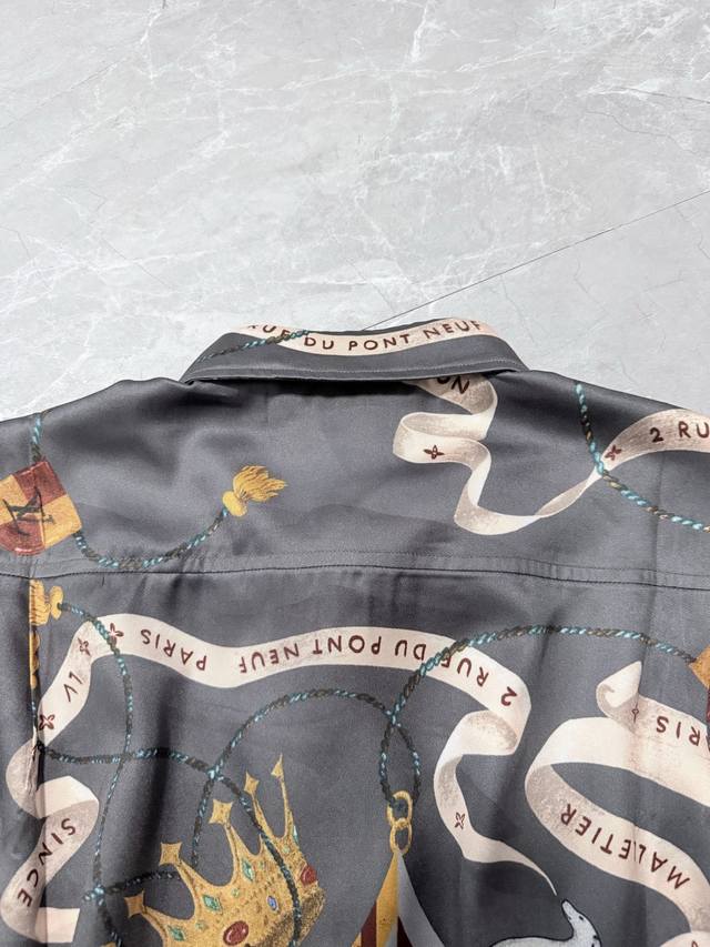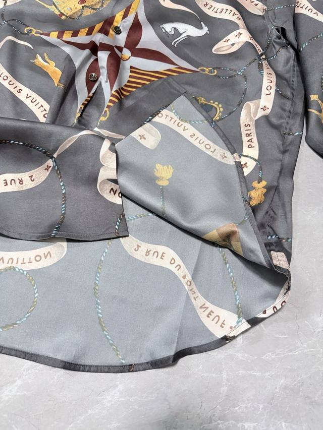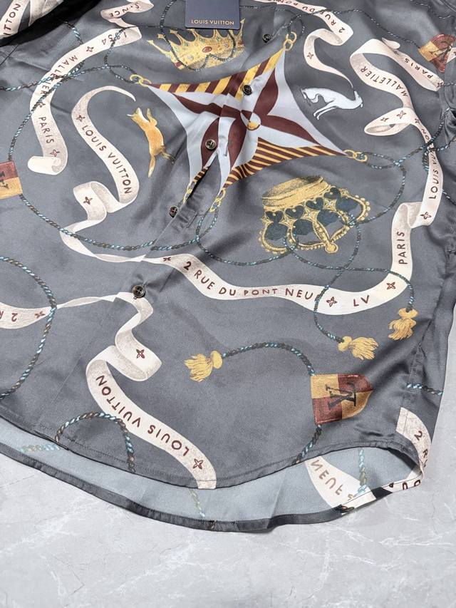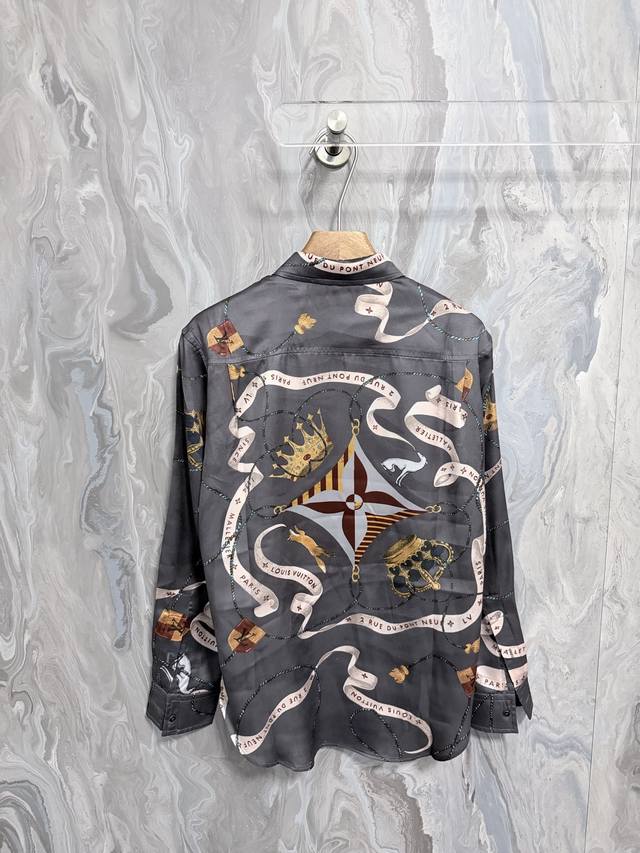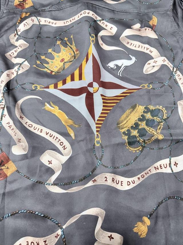 This new Louis 25 flowing shirt is made of mulberry silk and features the collection's opulent Louis Emblem pattern. The base print includes ribbons, the brand logo, a crown, Monogram flowers, dogs, and a playful fox. Luxurious and sophisticated, it's perfect for a festive evening look. Sizes: S, M, Xl.