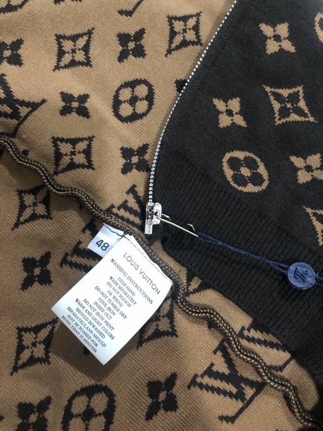 Autumn/Winter LV All-over Print Knit Zipper Sweater. Exquisite workmanship, pure cotton fabric, stand collar, zipper design, slim fit, high-end feel. Unisex style, suitable for everyday casual wear. Sizes: Size 48 fits 90-110 lbs, Size 50 fits 110-130 lbs, Size 52 fits 130-160 lbs.