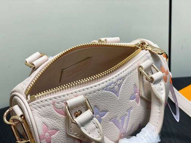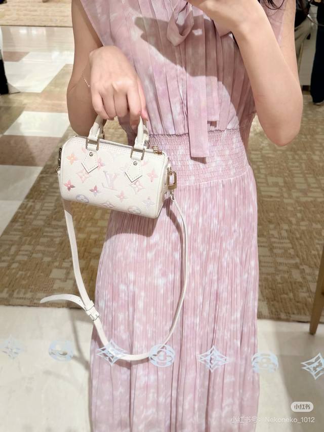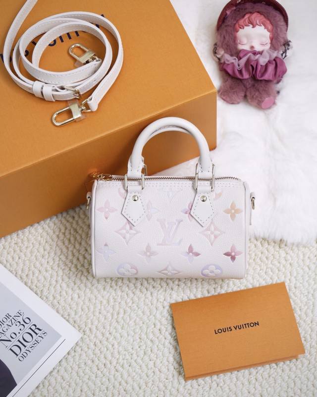 comes with a foldable gift box. Lv's new Speedy Nano in a dreamy gradient purple. Original version. Who can resist such a charming little bag? This quintessentially gentle purple accentuates your style. Perfect for everyday commuting or dating! Compact yet incredibly versatile. Classic monogram with dreamy purple embossing creates a subtle gradient for a natural, effortless transition. Size: 16cm.