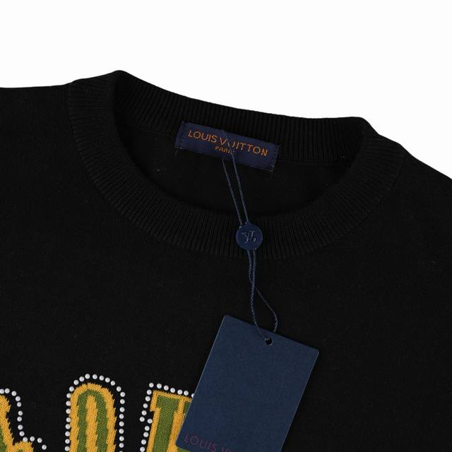 DDD Louis Vuitton jacquard knit short-sleeved sweater with imported hot-fix rhinestones on the front and back. This short-sleeved knit sweater is made of densely spun cotton, featuring a classic design and jacquard knitting. The front and back panels feature a jacquard design. The fabric is comfortable and has an excellent feel. Unisex style. Colors: Gray, Black. Sizes: Xs, S, M, L.