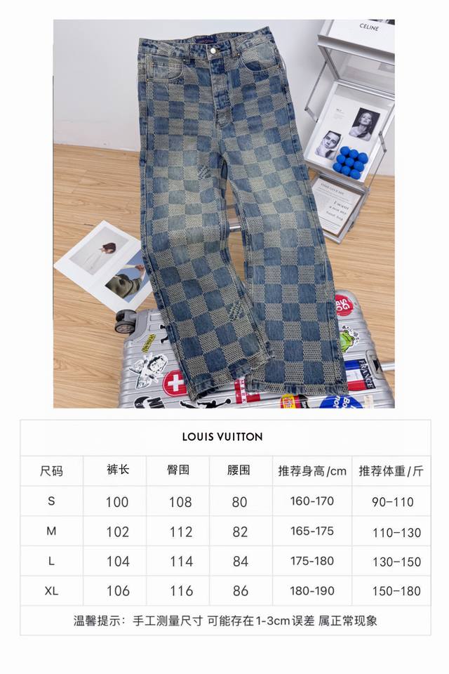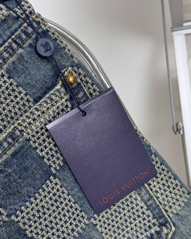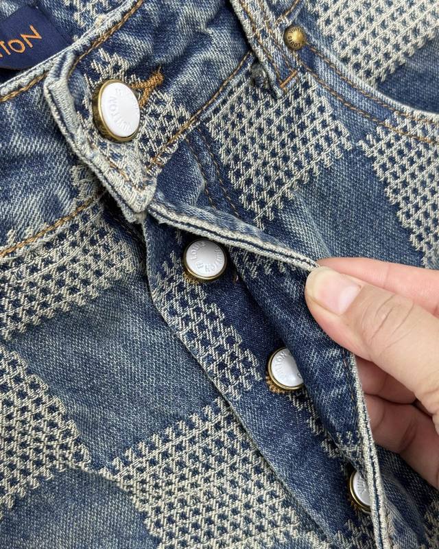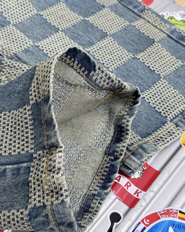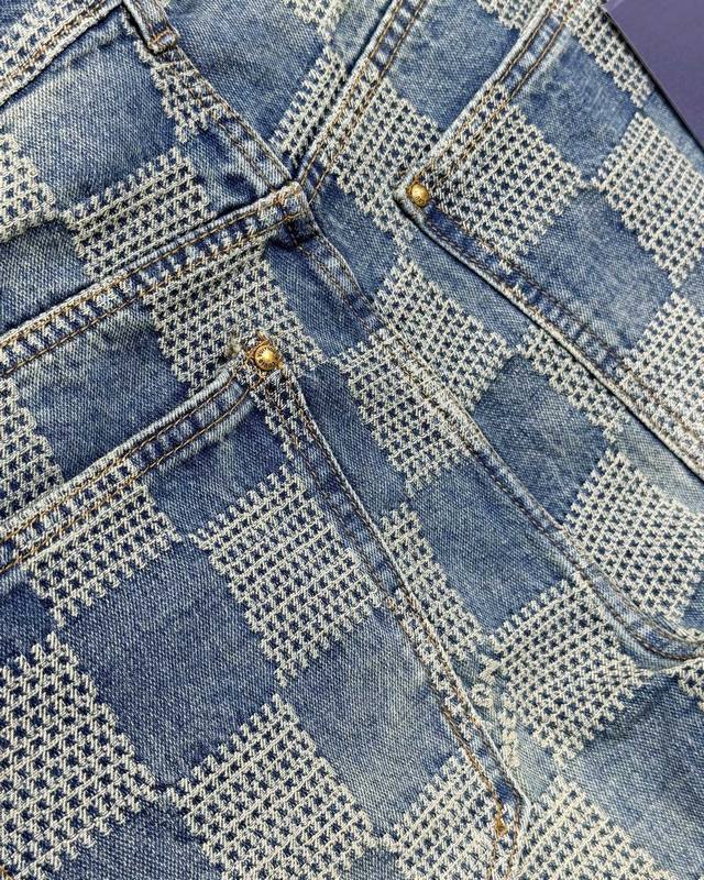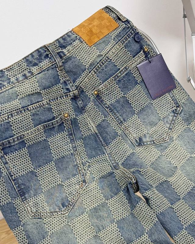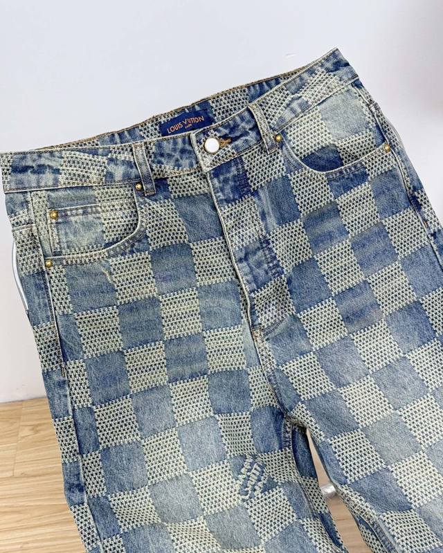 LV Distorted Damier Autumn/Winter 24th Limited Edition Checkerboard Denim. Louis Vuitton 24Fw New Limited Edition Checkerboard Patchwork Washed Blue Denim Jacket and Jeans Set.