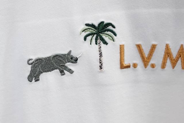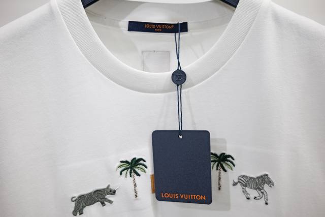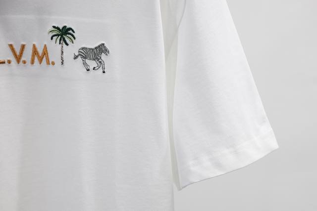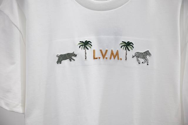 Distinguish fabric count and thickness Ddd New Arrival Ddd This 280G classic off-white short-sleeved crew neck blouse is embroidered with the signature from the Spring/Summer 2026 show. The 3D LVM lettering on the chest, inspired by the house's heritage tree trunk, is framed by an intricate palm tree and animal motif from Lv X The Darjeeling Limited. Ddd Regular Fit Ddd Off-White Ddd Embroidered pattern and signature on the chest Ddd Ribbed collar Ddd: White Ddd: Size X4 Ddd Ddd