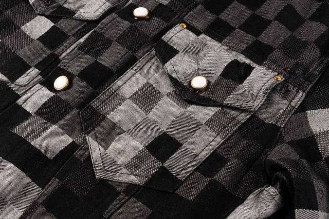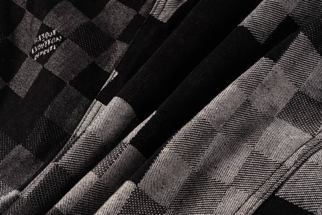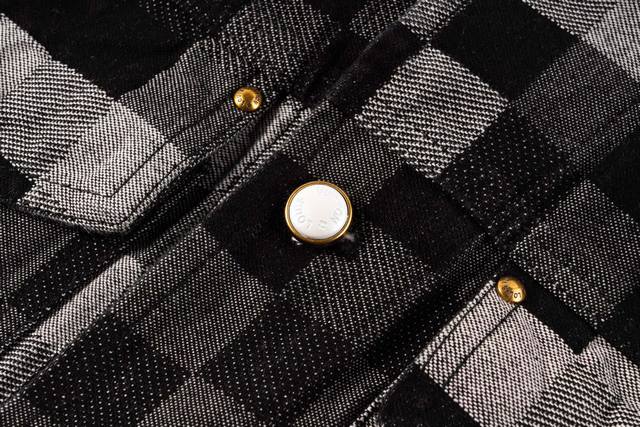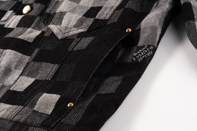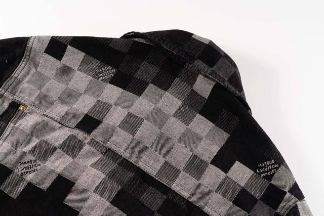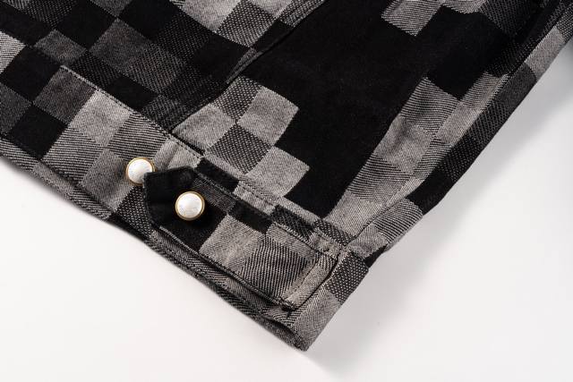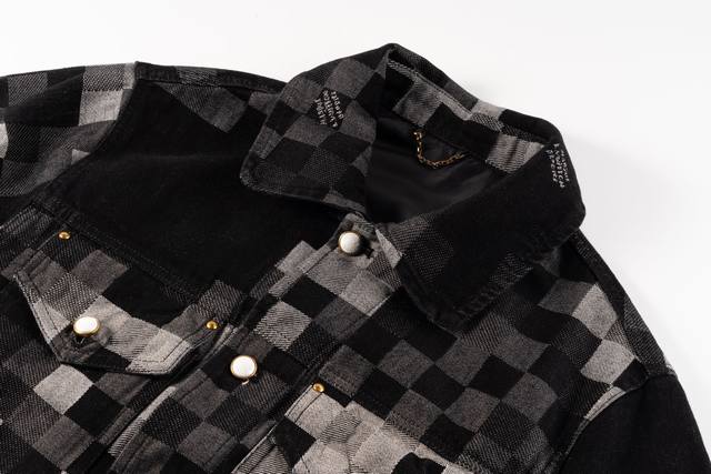 Evergreen Top-Tier Version Louis Vuitton Pharrell Williams Collaboration Mosaic Checkered Denim Jacket. This is a true-to-life, original-quality custom-made twill cotton denim jacket. The jacquard lettering on the denim is reproduced one-to-one. Due to the manual layout and cutting, the fabric wastage is very high. The jacquard patterns are of uniform size and spacing, and the width of the patterns is consistent, making the workmanship extremely complex. The washing process uses a fermented wash to create an aged look. The original pearl hardware with laser-engraved logo has a minimum order quantity of 60,000 pieces. All 13 pearl buttons are hand-sewn. All accessories are custom-made to match the new design, with perfect attention to detail. The relaxed denim cut is crisp and stylish, while the contrasting light and dark color mosaic jacquard texture exudes a high-end and fashionable feel. Double pockets on the chest accentuate the overall design, and jacquard lettering highlights the brand's identity. An unrepeatable work of art. Style No.: 1655# Color: Black Size Chart: M, L, XL, Ddd M: Shoulder width 48cm, Length 66cm, Chest 114cm Ddd L: Shoulder width 49cm, Length 67cm, Chest 118cm Ddd XL: Shoulder width 50cm, Length 68cm, Chest 122cm