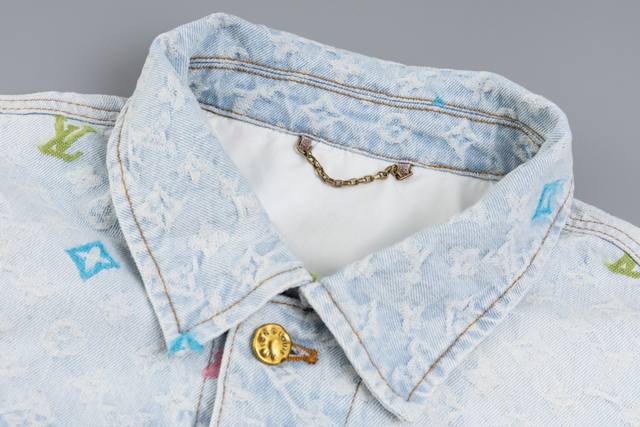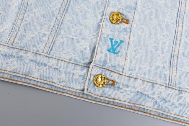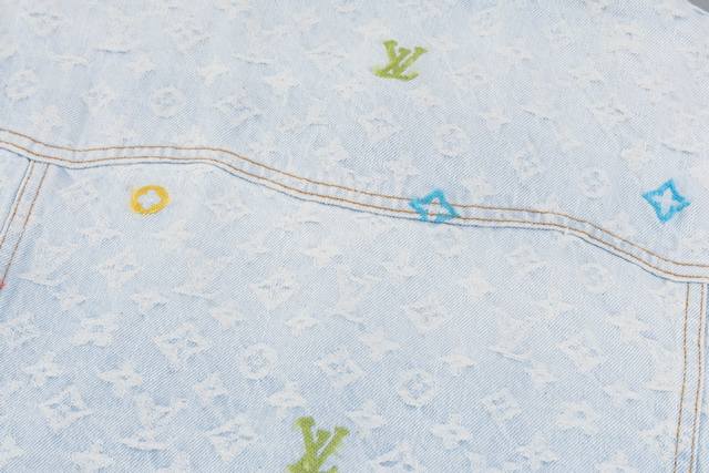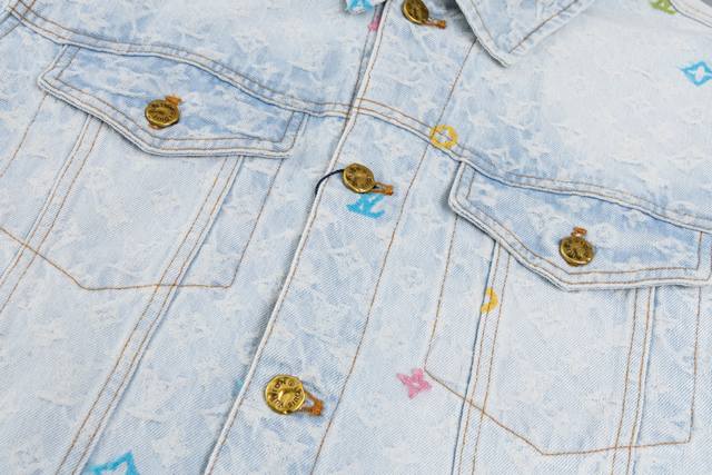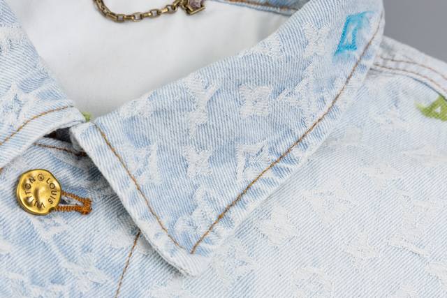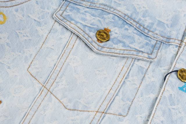 Lv x Tyler embroidered denim jacket. Made from custom-made twill cotton jacquard denim, this jacket features a distressed, vintage-inspired light gray-blue wash pattern and is embellished with a monogram pattern. Leather cuffs complement the front pockets, and the jacket features a button-down design. This collection is available for custom styles. Sizes: 46, 48, 50, 52.