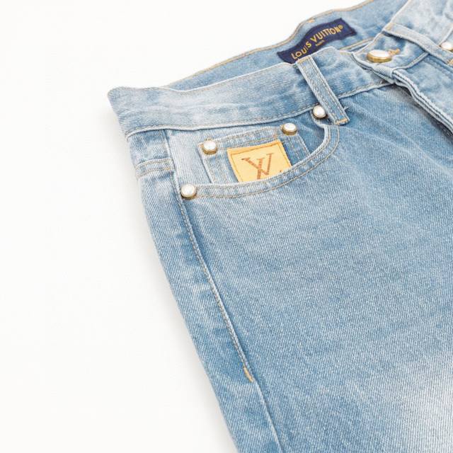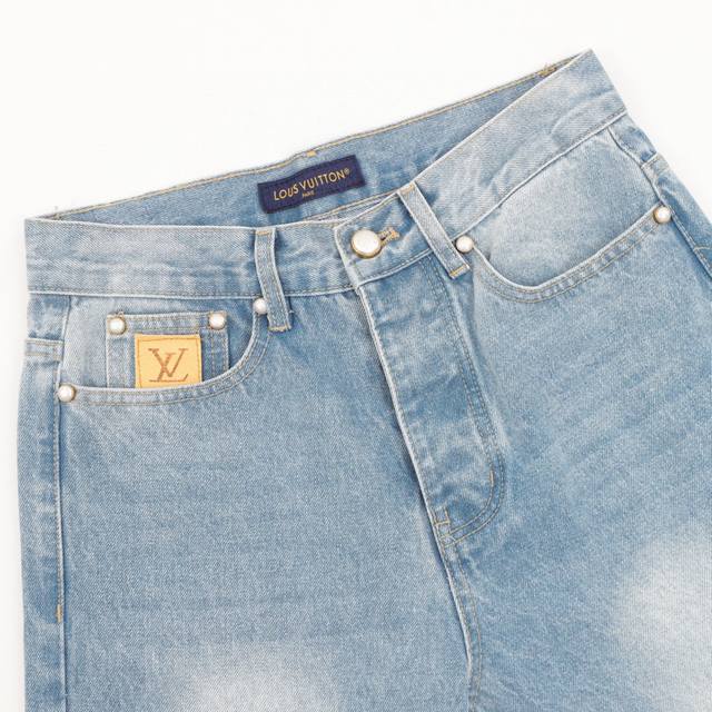 High-quality Ddd Lv embroidered pocket denim blue jeans, original version purchased. Made with 480g denim fabric, the jeans are breathable and comfortable after washing. Features original molded buttons with checkerboard hardware. The fit is crisp and stylish. The wash color is comparable to YB (presumably a brand name), and the buttons are custom-made with pearl material. The hardware is molded using imported special machines, and the embroidered logo and leather patch details are three-dimensional and highly accurate. The jeans have a thick and delicate feel, and the overall finish is good after washing. They are soft, thick, and delicate to the touch. High-quality replica, simple and versatile design, unisex jeans! Style number: 1659# Same style jacket in stock. Color: Blue. Sizes: S, M, L, XL.