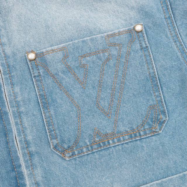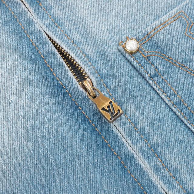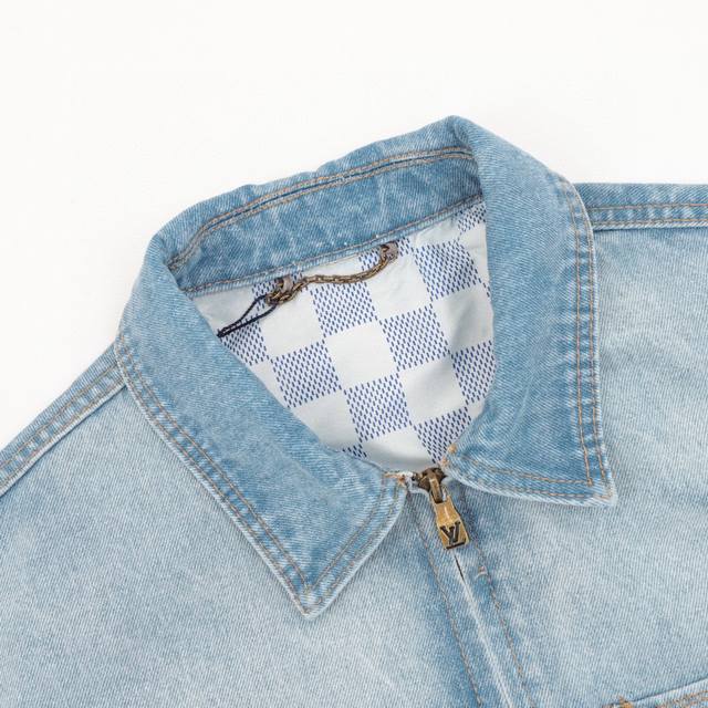 Hot Selling Item - High-Quality Ddd Louis Vuitton Lv25 New Limited Edition Denim Jacket with Large Logo and Gold Thread Embroidery on Pockets. This Lv embroidered pocket denim blue jacket is made of original 480g denim fabric. After washing, the fit is breathable and comfortable. It features original molded buttons with checkerboard hardware, a crisp and stylish silhouette, and a wash finish comparable to YB (presumably a specific brand or product). It also includes custom pearl buttons and a custom original quality zipper. Exquisite embroidery, comparable to the original, unisex style. Style No.: 1658# Color: Blue Sizes: 46, 48, 50, 52. Sizes: 46 (Length 66cm, Shoulder Width 48cm, Chest 120cm); 48 (Length 67cm, Shoulder Width 49cm, Chest 124cm); 50 (Length 69cm, Shoulder Width 50cm, Chest 128cm); 52 (Length 70cm, Shoulder Width 51cm, Chest 132cm).