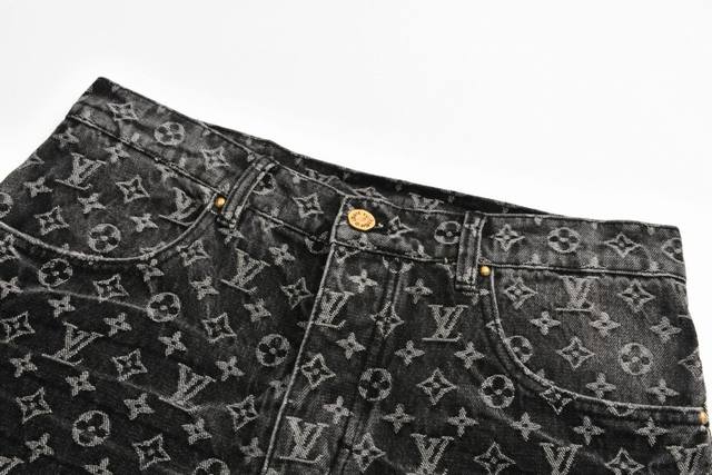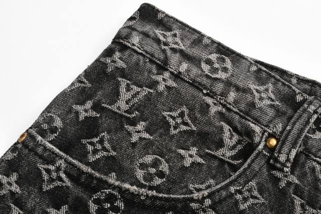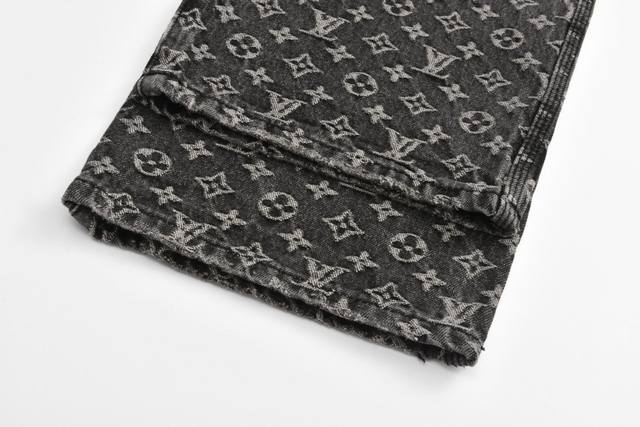 . Originally purchased for 15,500, these versatile all-over jacquard jeans are backordered. Made from custom monogram jacquard denim, this fabric is both soft and durable. The fabric undergoes a garment-intensive wash process, with small areas of damaged napping added to the knees. The distressed design and residual yarn hair create a distressed effect. The pants' construction was carefully crafted and redesigned, resulting in a fully hand-cut, fully printed, fully aligned pattern. The pattern at the waistband, hem, and hip pockets are all aligned, a process that requires significant fabric wear and labor. The Little Red Man embroidery on the back utilizes a three-dimensional core embroidery technique, using lustrous mercerized thread to enhance the raised pattern's shading. The back waistband leather patch is made of genuine top-grain cowhide suede, which is different from synthetic leather in quality. The threshold is opened and closed with 1 large and 4 small craft buckles and copper-plated painted hardware buckles.